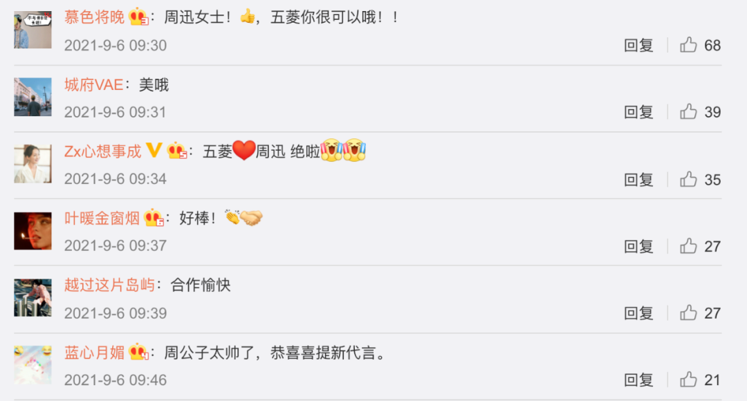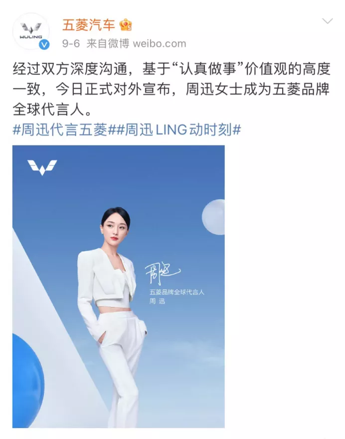 这不,去年9月,周迅成为五菱品牌全球代言人。