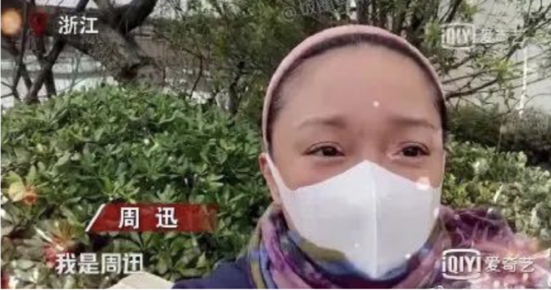 录制VCR时,别人都妆发齐全地端正站在镜头前,只有周迅素颜戴着口罩和围巾出现。