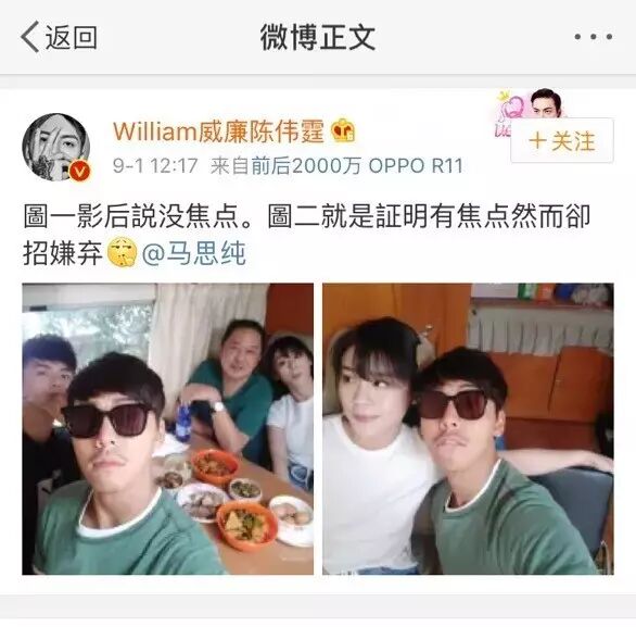 近日由陈伟霆、马思纯主演的新剧正在拍摄中。在拍摄间隙,陈伟霆在微博晒出与马思纯等人的自拍,并配文称:“图一影后说没焦点,图二就是证明有焦点然而却招嫌弃。”
