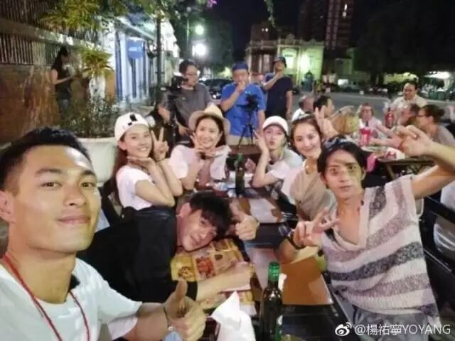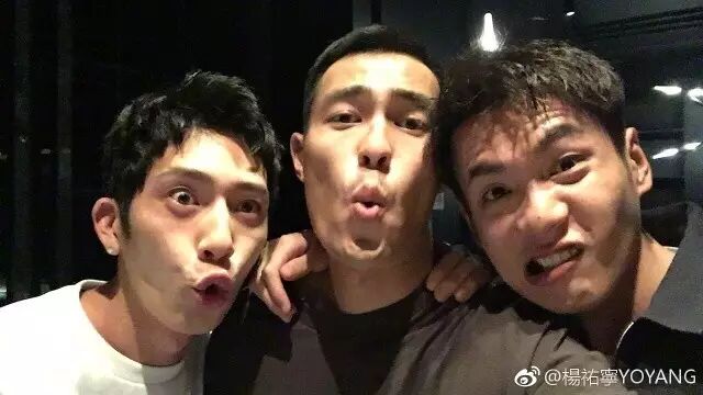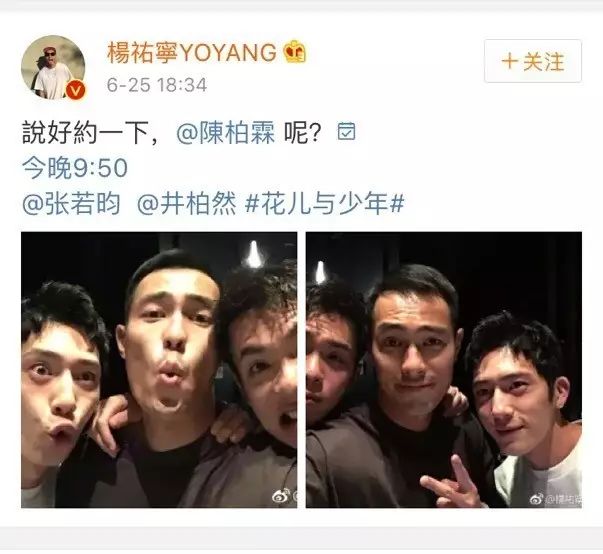 杨祐宁在微博上发过两张与井柏然、张若昀的合照。