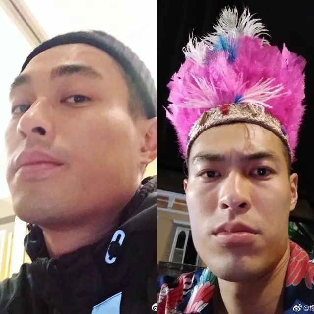 微博前几张别人拍的照片帅出天际,后几张自拍除了与大表姐的合照是正常不抖得的,别的走的都是迷幻风。
