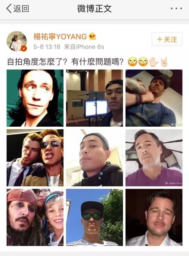 对此,就有网友对杨祐宁自拍的蜜汁角度提出抗议,杨祐宁还拉一众男神下水,暗示抖森也爱打光,布拉德皮特和德普也爱仰拍……
