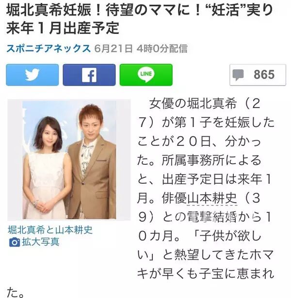 堀北真希09年和老公山本耕史共同出演《家有六子》相识,2015年5共同出演舞台剧《岚が丘》擦出火花开始交往,同年8月火速闪婚。今年拍戏结束后,开始造人计划。Maki2011年在节目中表示过想当妈妈,还说想生四个孩子,想拥有一个热闹的家庭。
