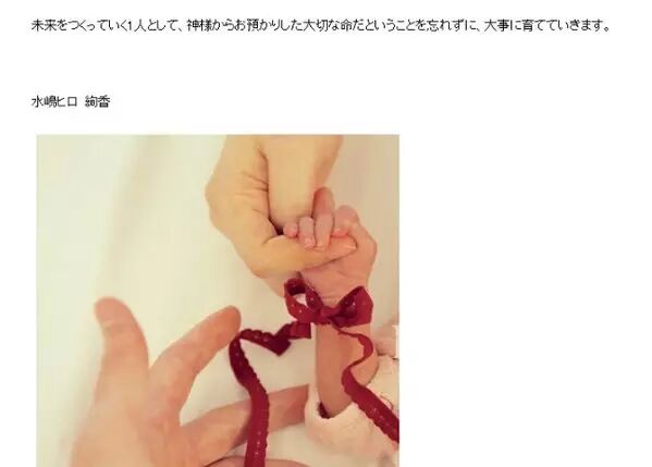 日本演艺界公认的好男人水岛宏和歌姬绚香在2015年6月19日拥有了一个女儿,2008年交往,2009年结婚,在绚香患疾病隐退时,水弟一直陪在身边细心照顾着绚香,真心希望两人的爱情结晶能够健康长大!