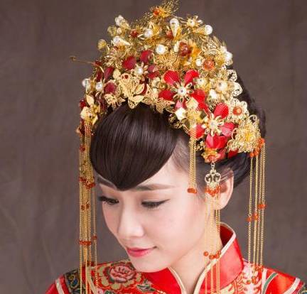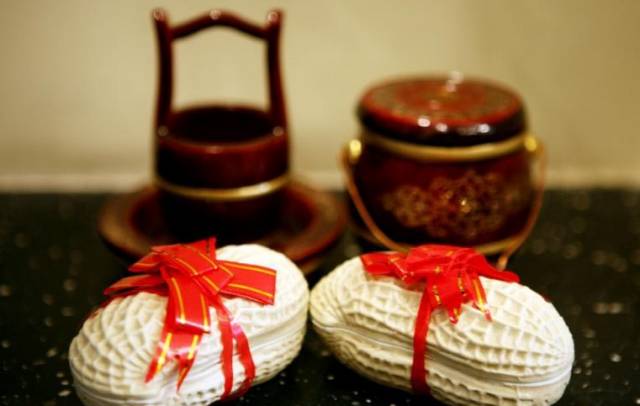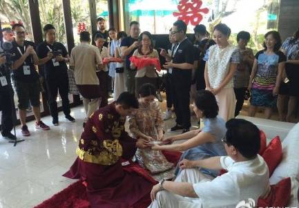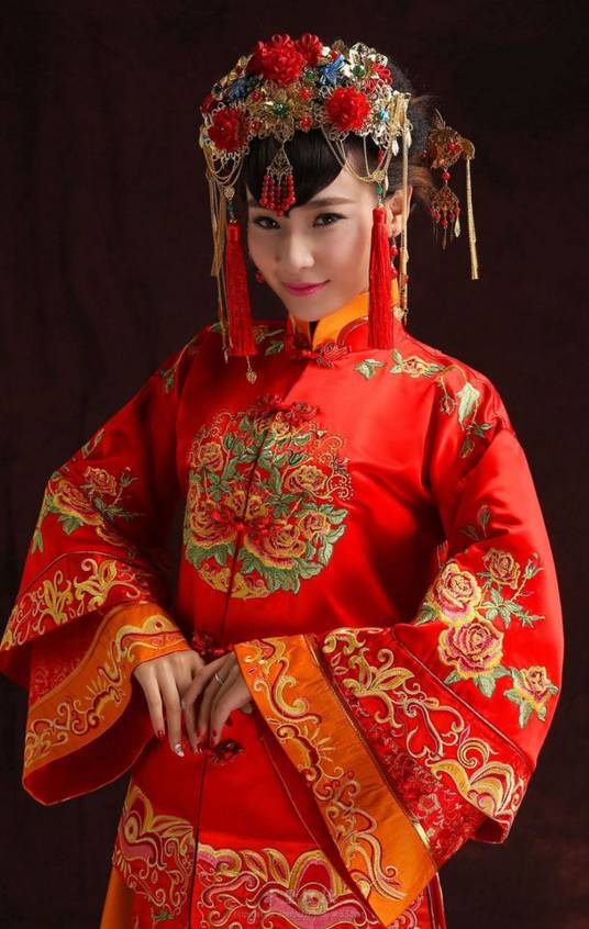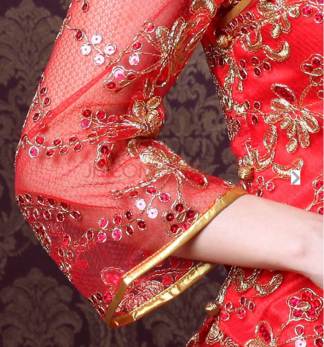 新娘这件呢,叫潮绣裙皇,采用的工艺是四大名绣之一的潮绣,立体盘扣闻名,上面有立体龙凤图案,用时7412小时。