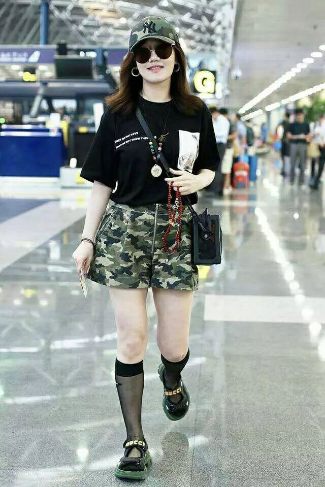 她上身穿着黑色的短袖,下身穿着迷彩的短裤,和帽子交相呼应,难道她是一个军装迷?她手里拿着一个像佛珠一个的饰品,看来确实是潜心皈依佛门啊,所以才会有这样的举动。薛佳凝的身高也不矮,162的身高看起来却不显高,肯定是她穿搭的原因啊。