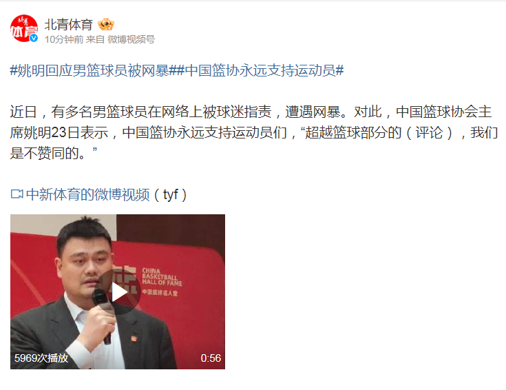 近日,有多名男篮球员在网络上被球迷指责,遭遇网暴。对此,中国篮球协会主席姚明23日表示,中国篮协永远支持运动员们,“超越篮球部分的(评论),我们是不赞同的。”