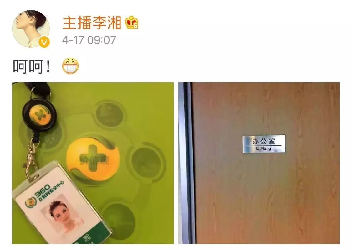 李湘此前在深圳卫视担任副总监和首席艺术监制,今年1月11日,李湘在微博确认已离职。今日,李湘又通过微博晒出在奇虎360的工作牌及专属办公室照片,正式证实其跳槽360的传闻。