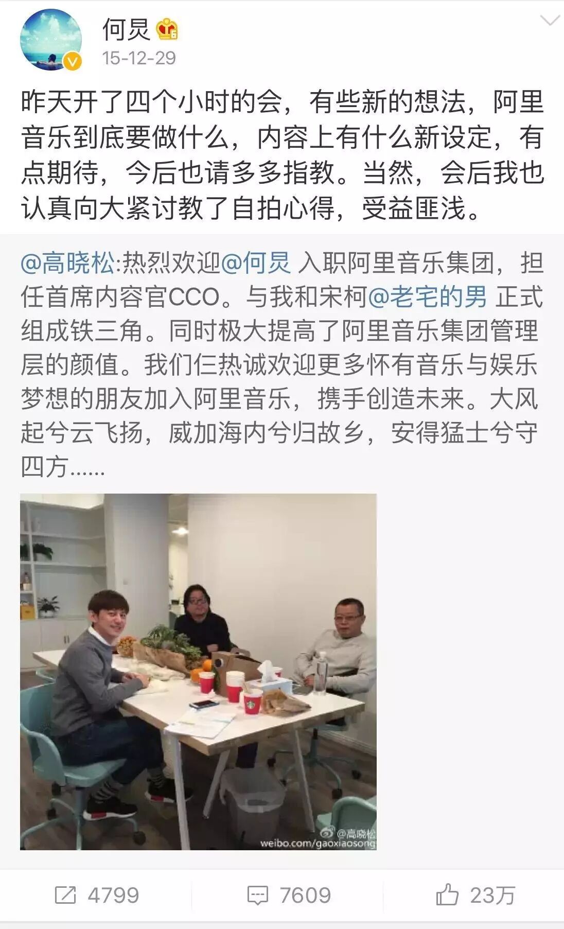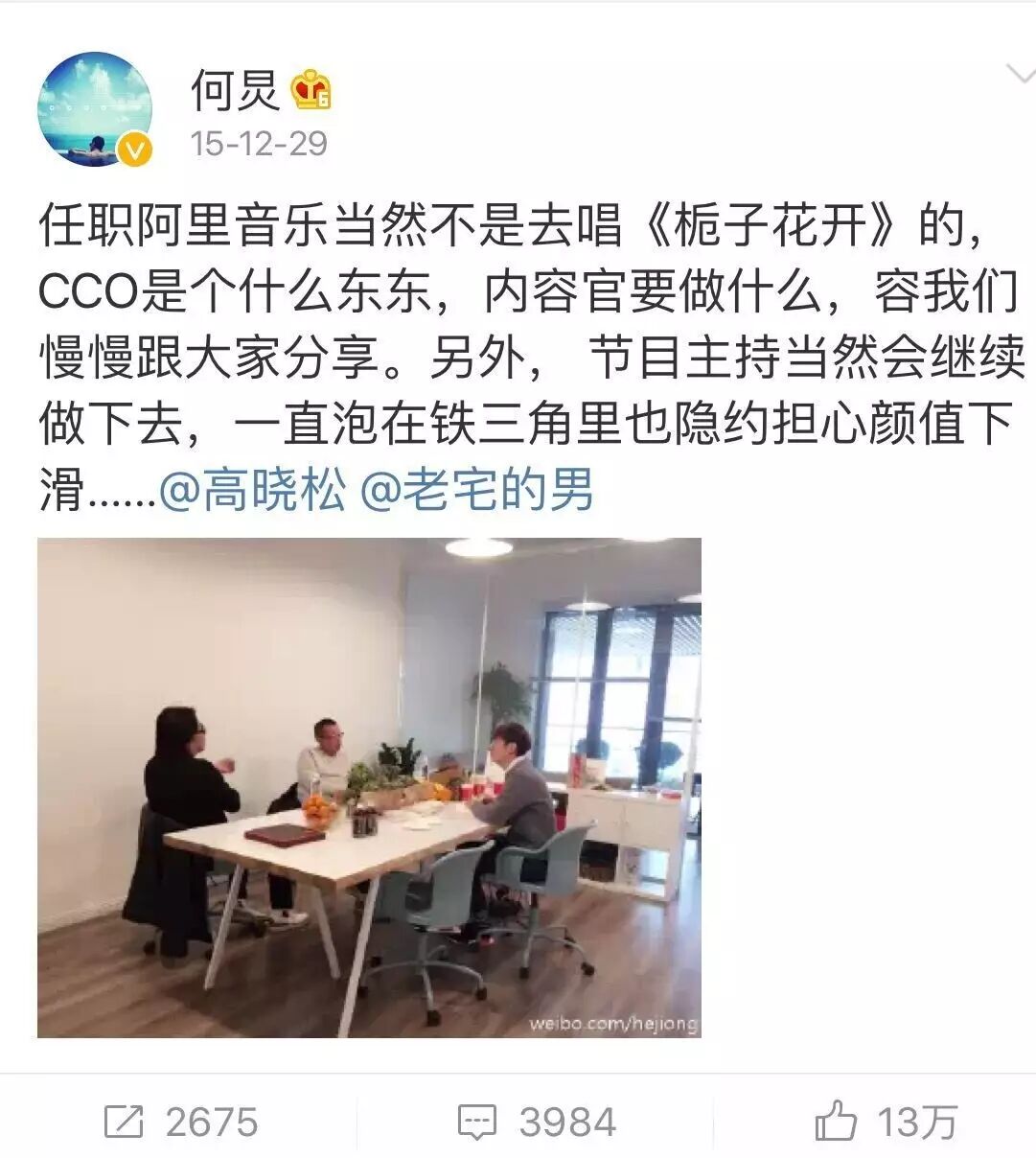 而对于阿里音乐来说,何炅的的媒体资源和影响力应该是更被看中的点。作为湖南卫视最知名的主持人之一,何炅背靠的是拥有湖南卫视、天娱传媒、芒果TV的芒果传媒,另外微博粉丝高达700多万,媒体形象也极为正面。这些都会极大增强阿里音乐的竞争力。所以可以想象,虽然何炅并不是全职负责CCO的工作,但带来的价值却并不低。