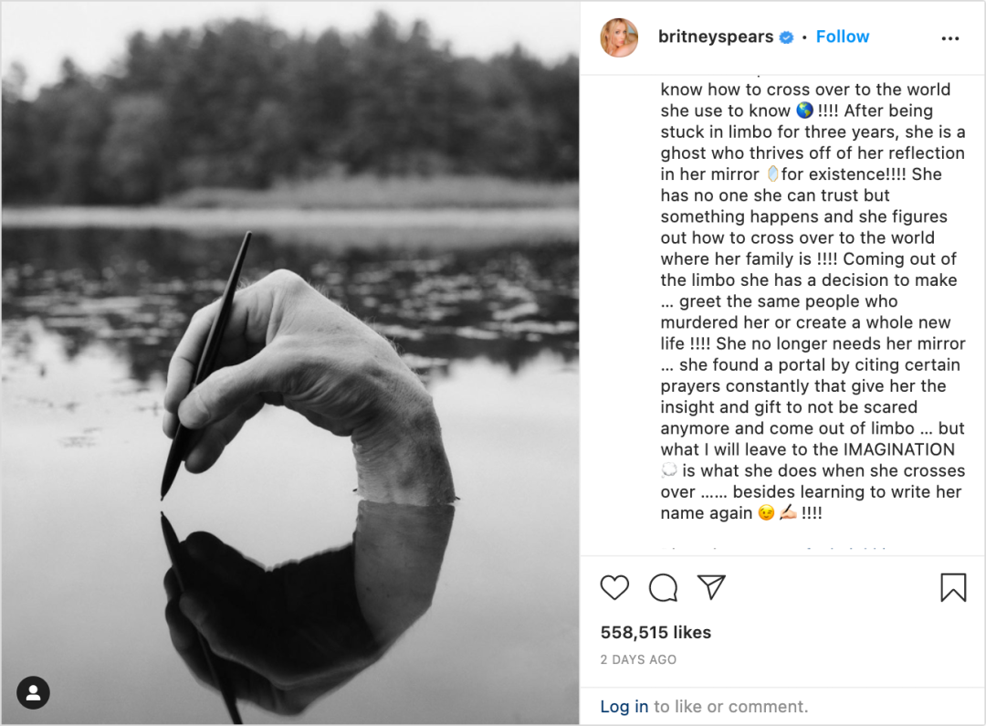 据美国福克斯新闻,上周五,布兰妮·斯皮尔斯在社交平台Instagram上透露了她正在写一本书的消息。贴图是一张黑白照片,一只手拿着笔在湖中出现。在附文中,布兰妮说:“我正在写一本关于一个被谋杀的女孩的书……她的幽灵因为创伤和痛苦而陷入了困境,她不知道如何穿越到她曾经熟悉的世界。”