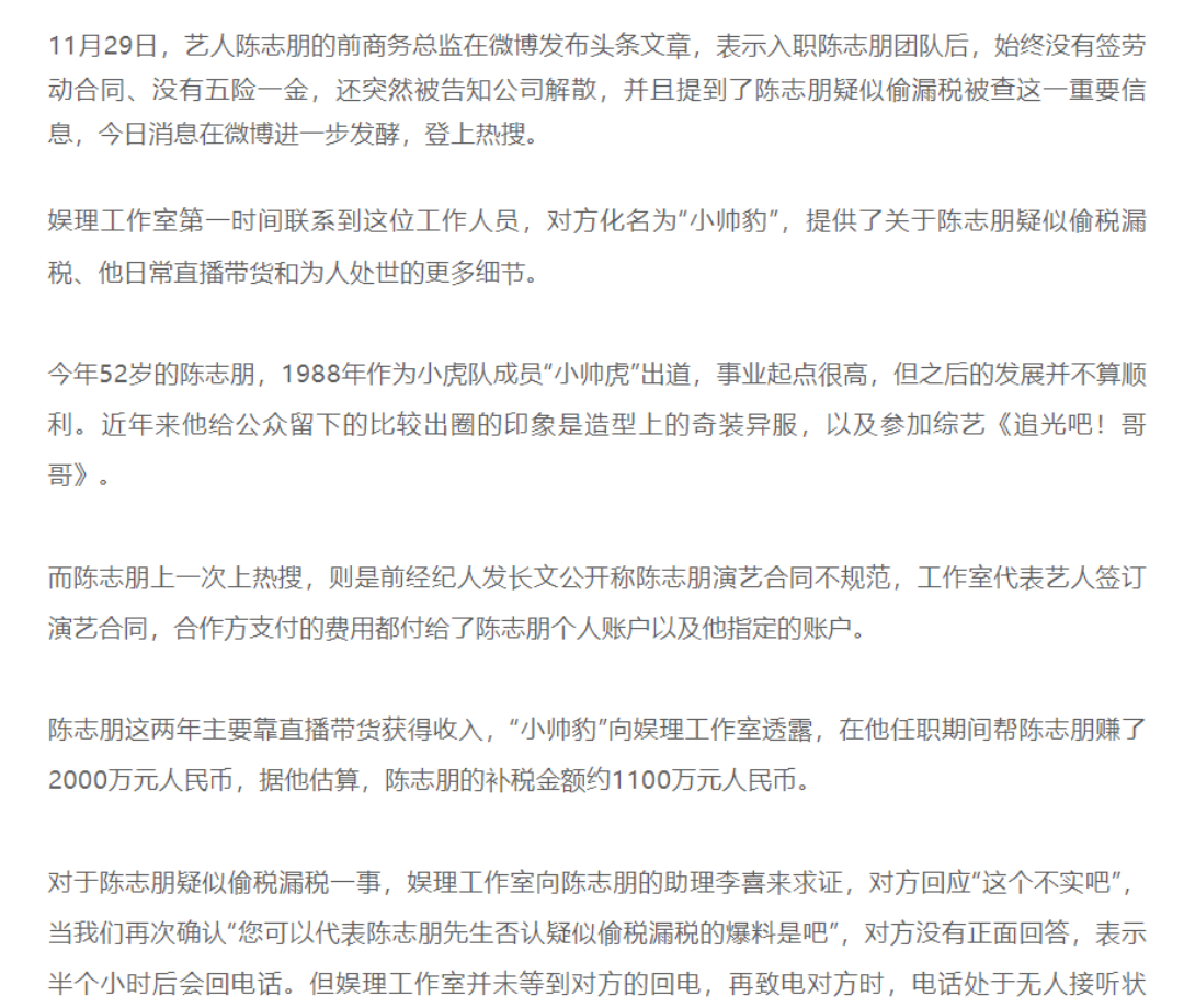 北京时间12月1日,陈志朋被举报偷税漏税,二度偷税被查,总共补缴税款1000多万,前员工的举报震惊网络。有媒体独家采访了爆料陈志朋疑似偷税漏税的工作人员,向外界透露了更多有关陈志朋疑似漏税偷税的细节。