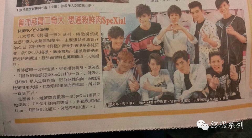八大《终极系列》缔造网络视频近30亿人次超高点击率,主要演员曾沛慈与SpeXial挟带《终极》所带来的热潮与魅力,这次难得合体齐赴港。22日上午十点曾沛慈和SpeXial抵达香港机场,吸引超过千名粉丝前来接机,将机场围的水泄不通,九人一出现,粉丝随即陷入疯狂,现场尖叫声震耳欲聋。