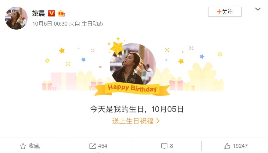 今年的生日微博,转发400,点赞19247。