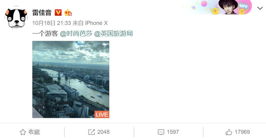 去年开始爆红的演员雷佳音,一条广告博,转发2048,点赞17969。