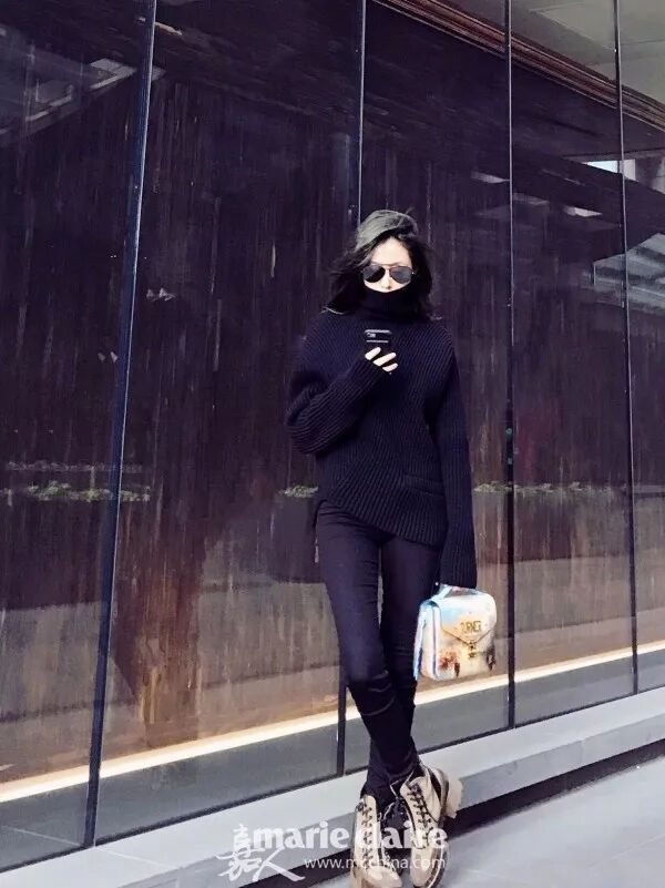 还有今年时尚达人们喜爱的高领毛衣,百搭的色系怎么穿都是时髦的出街LOOK,张天爱带黑色墨镜,身穿黑色高领oversized粗线毛衣,下穿黑色紧身铅笔裤,手拎图案包包,脚踩英伦风卡其马丁靴,酷劲满满。