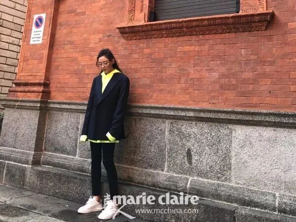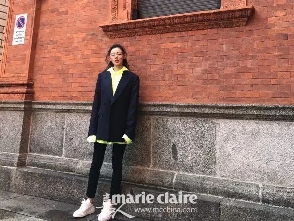 时尚的运动风结合英气的西装外套,这样的搭配简直不能再好看了!张天爱身穿黑色西装外套,内搭亮黄色连帽卫衣,下穿紧身铅笔裤,小露脚踝曲线优美线条,脚踩白色运动休闲鞋,时髦大气。