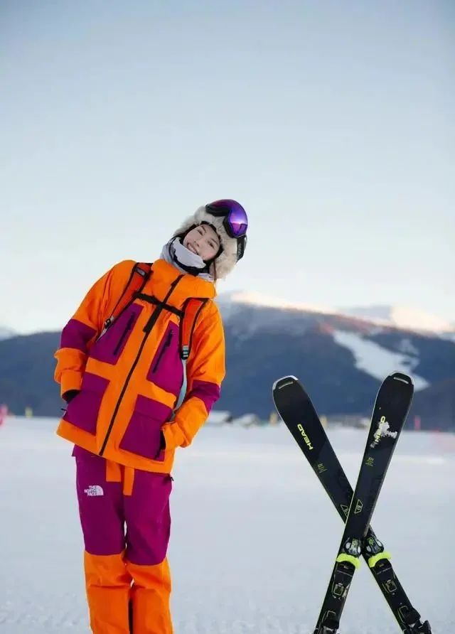 上镜的效果决定了服装的色彩选择,亮色系一定是最值得推荐的,尤其是衬托出肌肤白皙透亮的配色,更是必备的条件。像何穗这一套橙色和紫色拼接的滑雪服,不仅个性十足,还很好地衬托出她的好状态,上镜效果也很不错。
