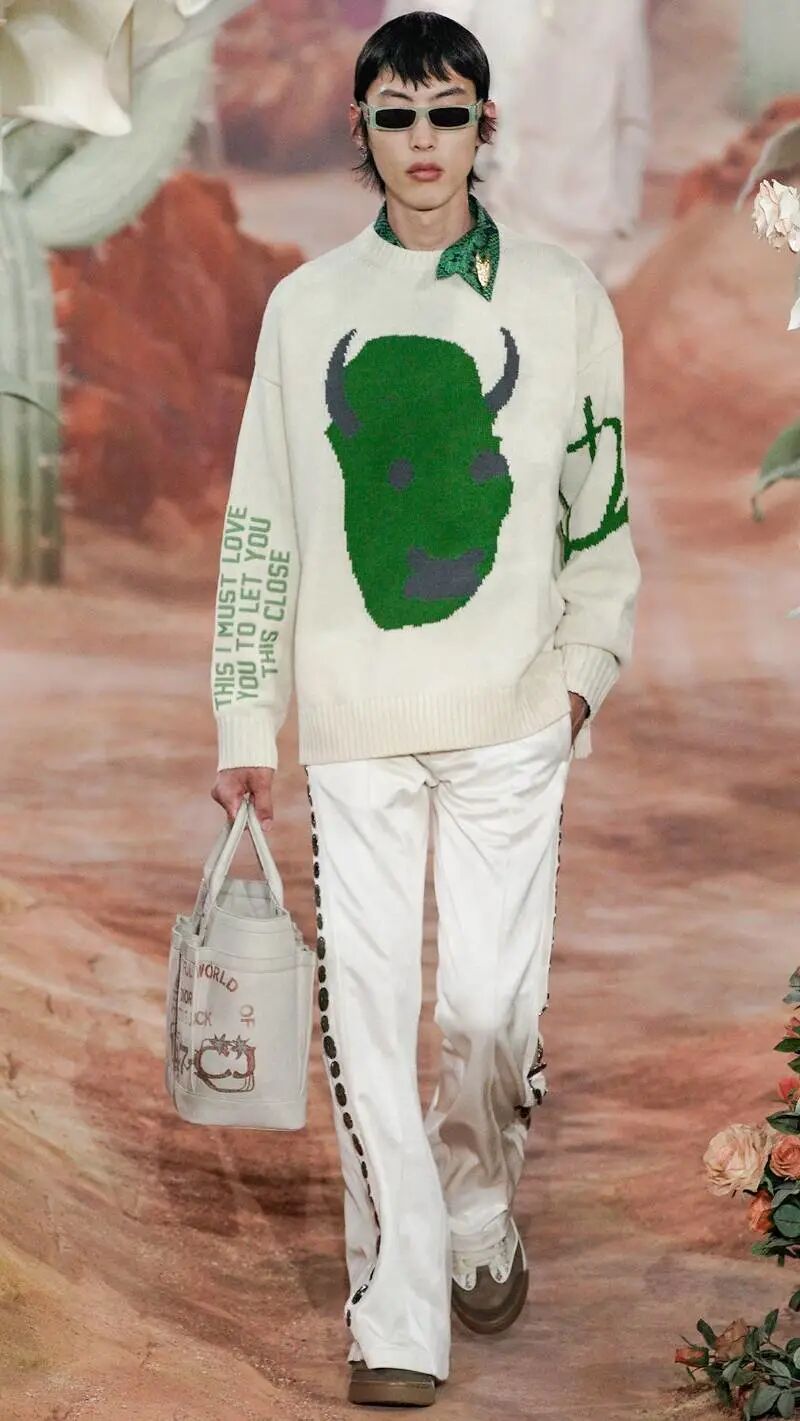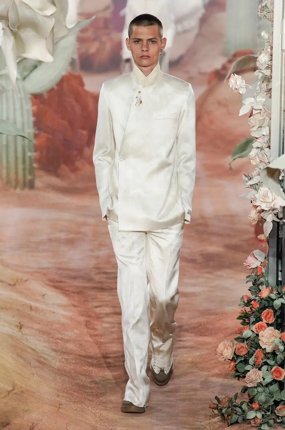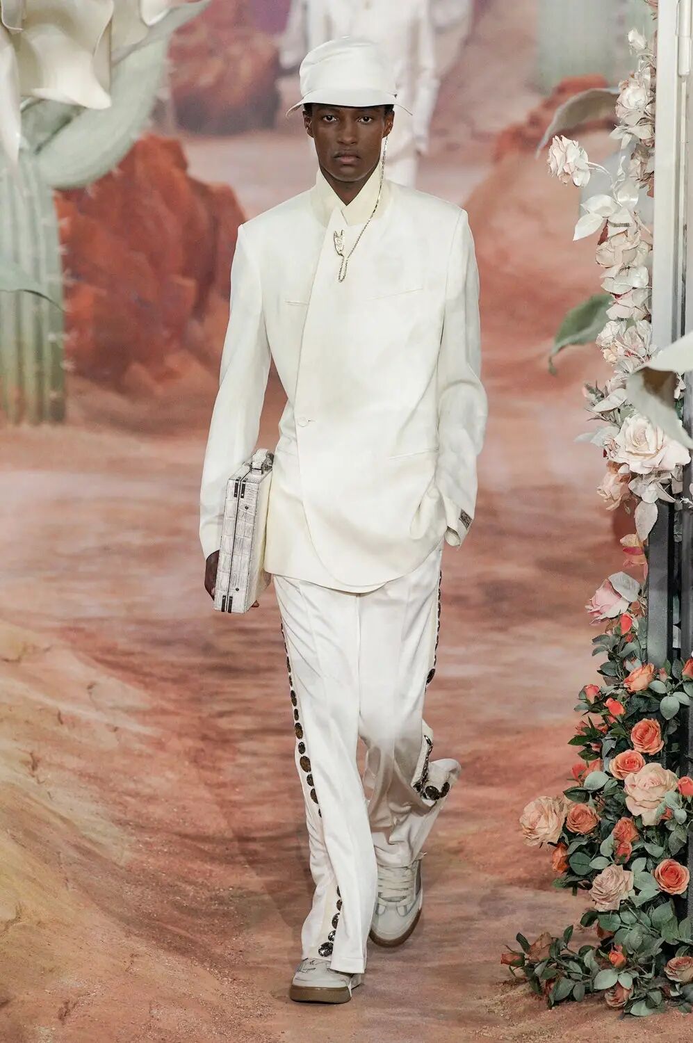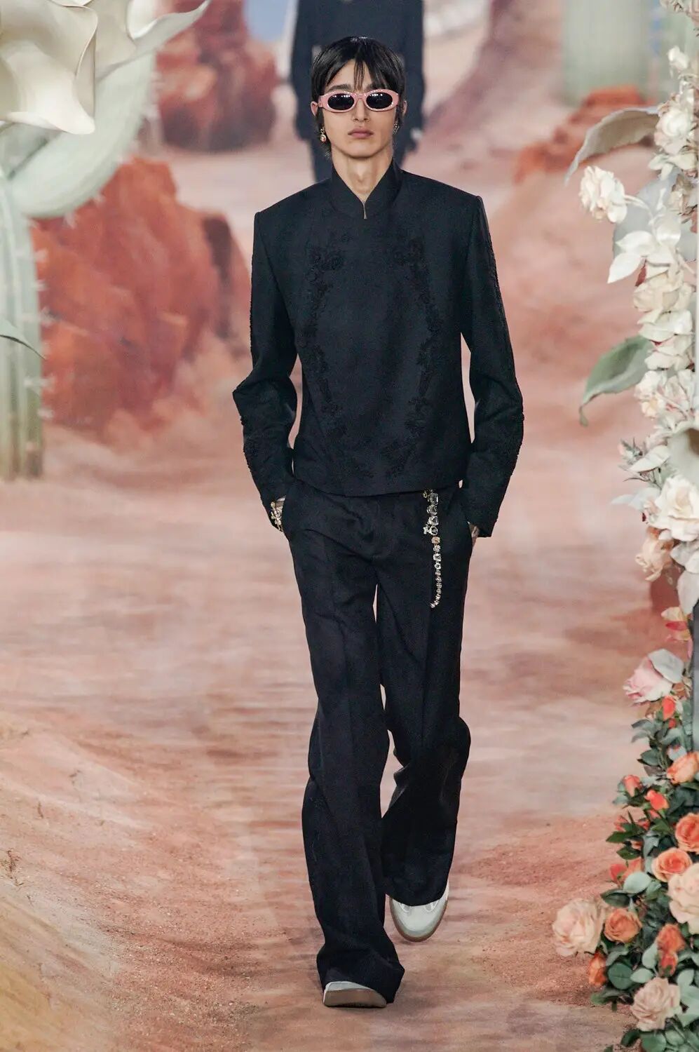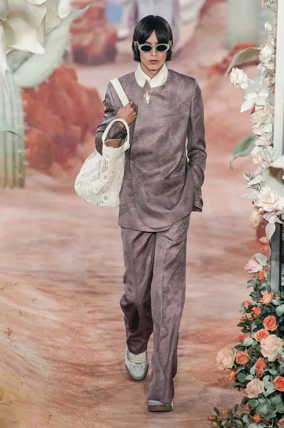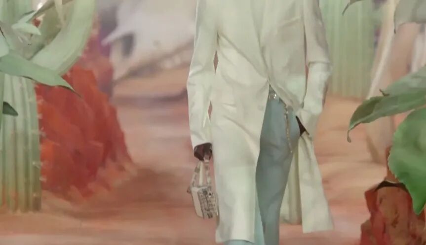 DIOR标志性印花变成了JACK的组合。茹伊印花(Toile de Jouy)变了新模样,“仙人掌印花”(Toile de Cactus)描绘出大气磅礴的沙漠场景,亦化为缀于西服之上的飘带刺绣。