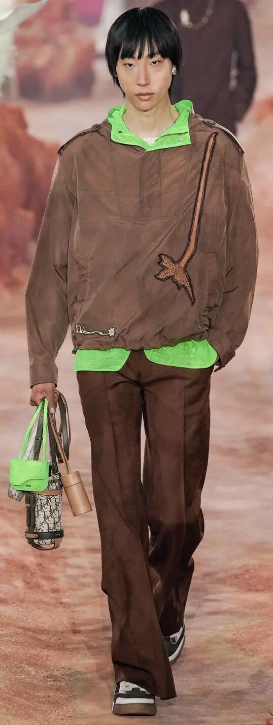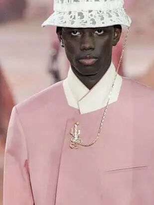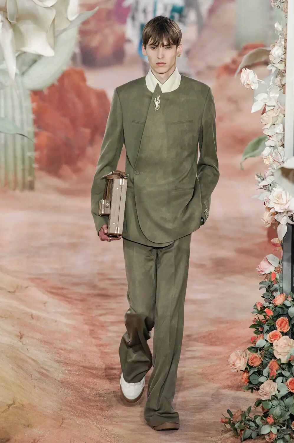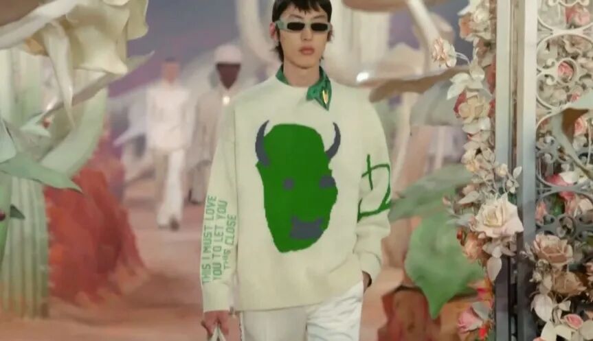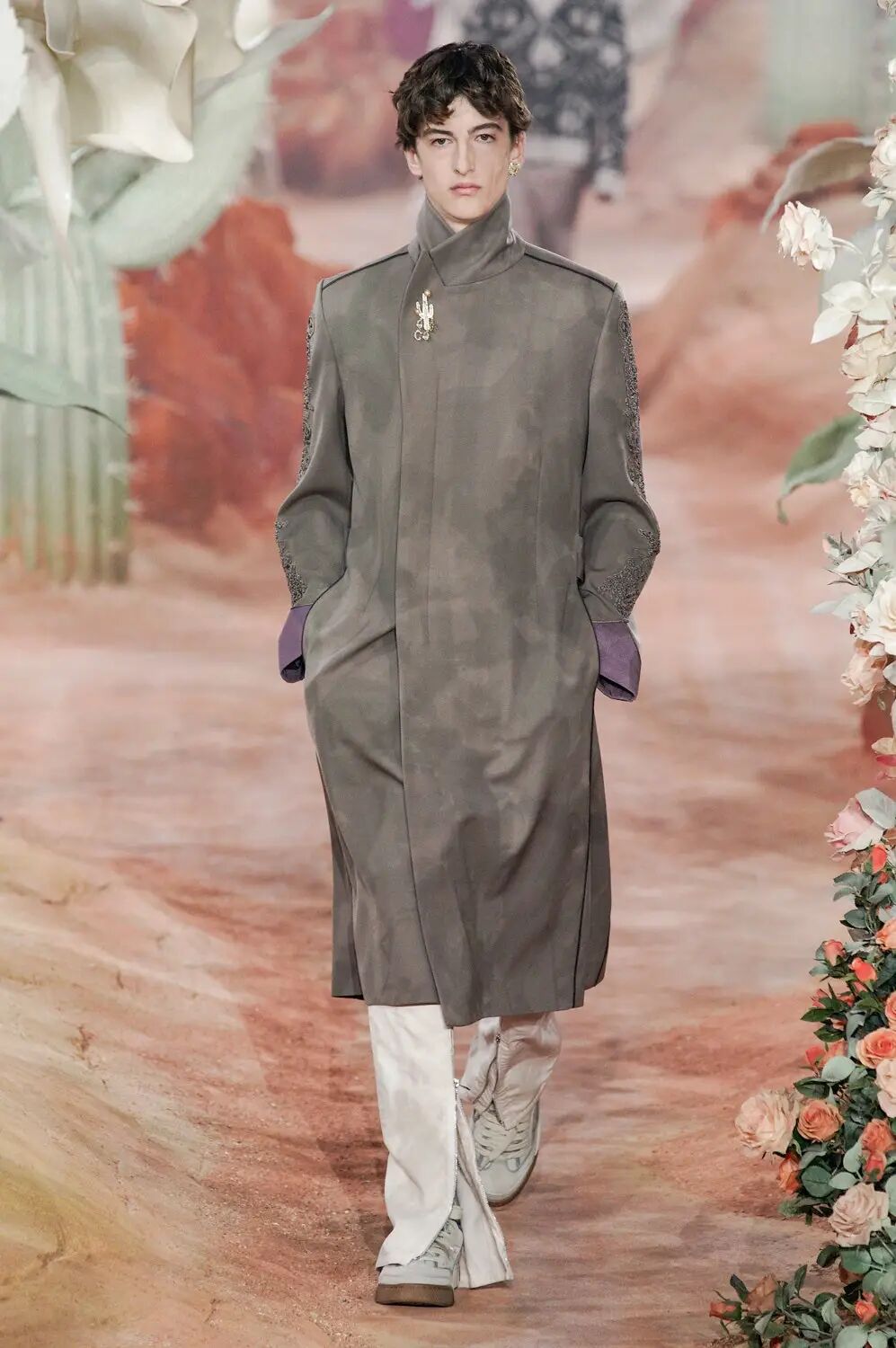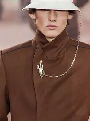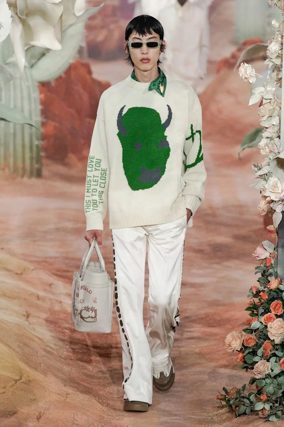 DIOR标志性印花变成了JACK的组合。茹伊印花(Toile de Jouy)变了新模样,“仙人掌印花”(Toile de Cactus)描绘出大气磅礴的沙漠场景,亦化为缀于西服之上的飘带刺绣。