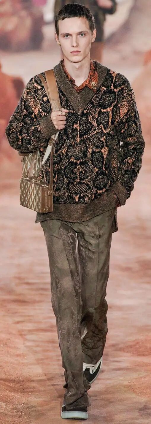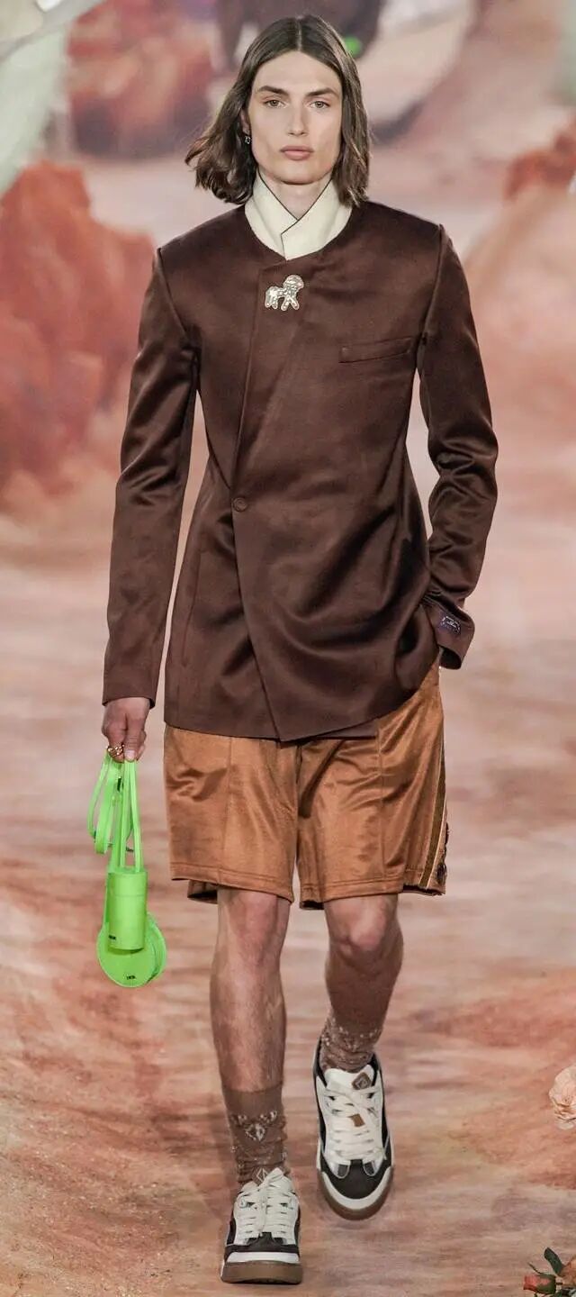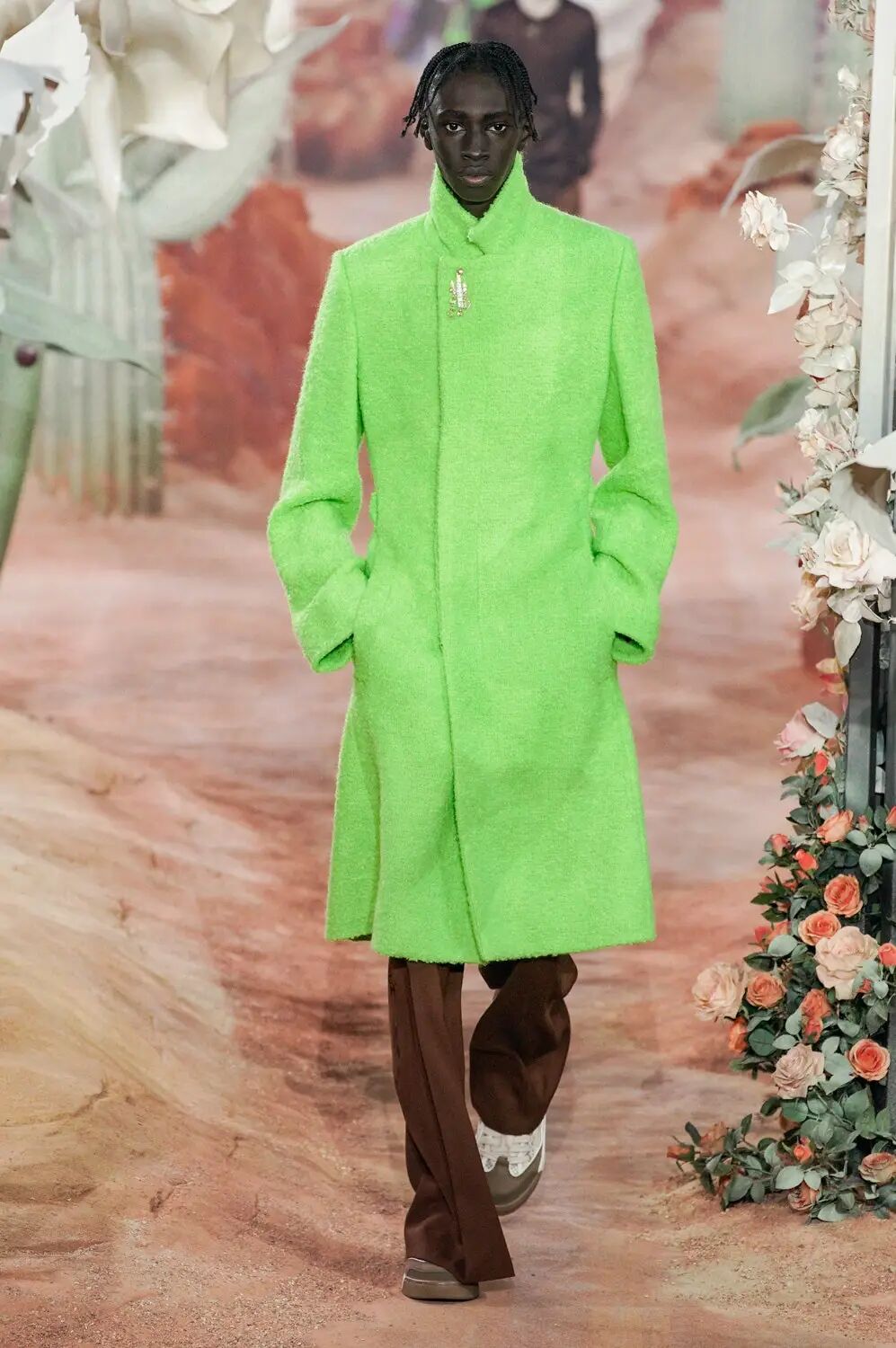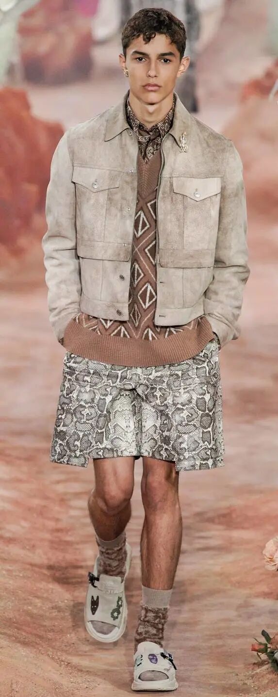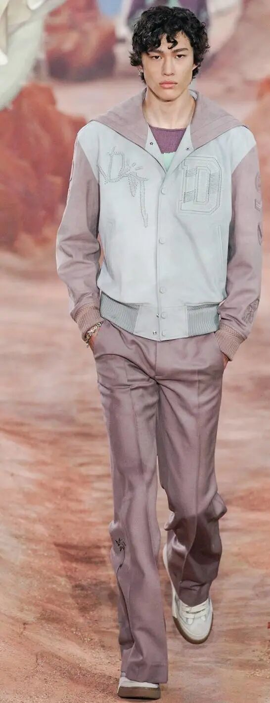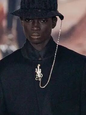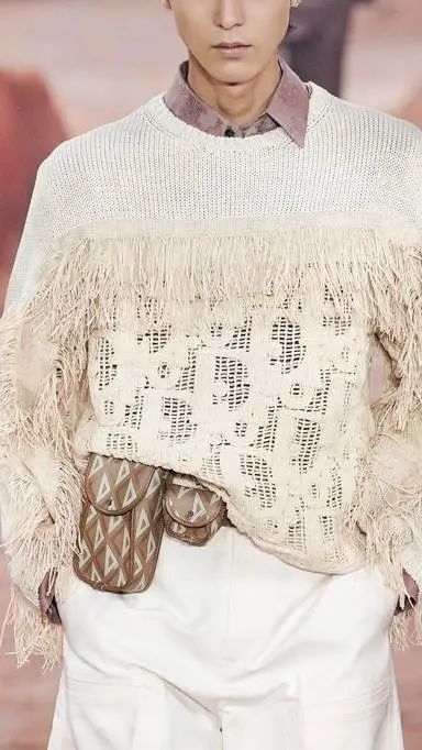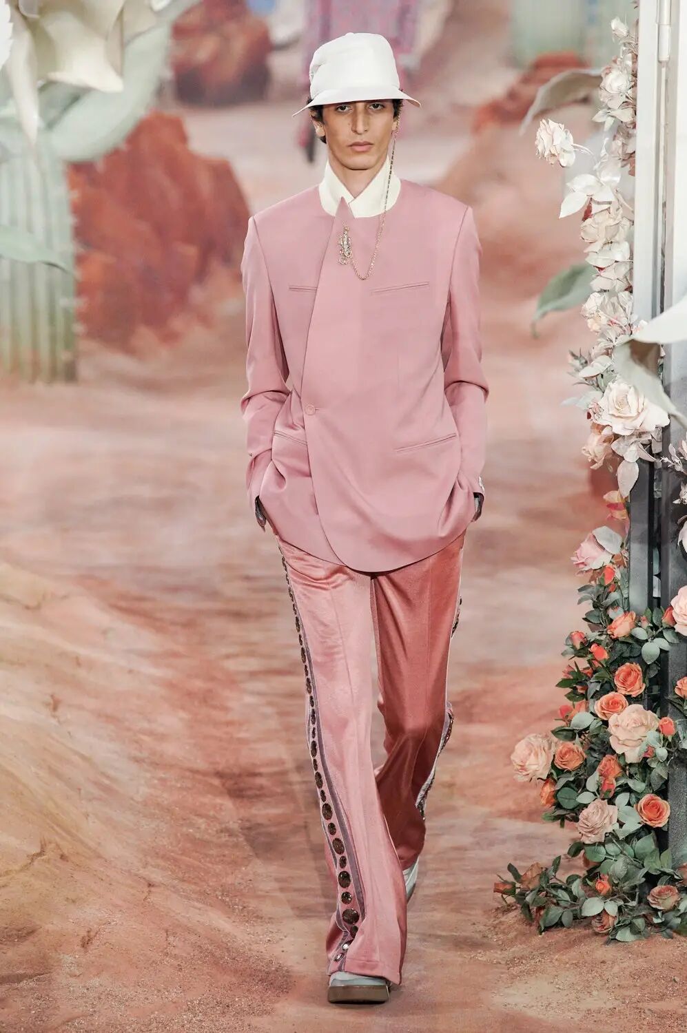 DIOR标志性印花变成了JACK的组合。茹伊印花(Toile de Jouy)变了新模样,“仙人掌印花”(Toile de Cactus)描绘出大气磅礴的沙漠场景,亦化为缀于西服之上的飘带刺绣。