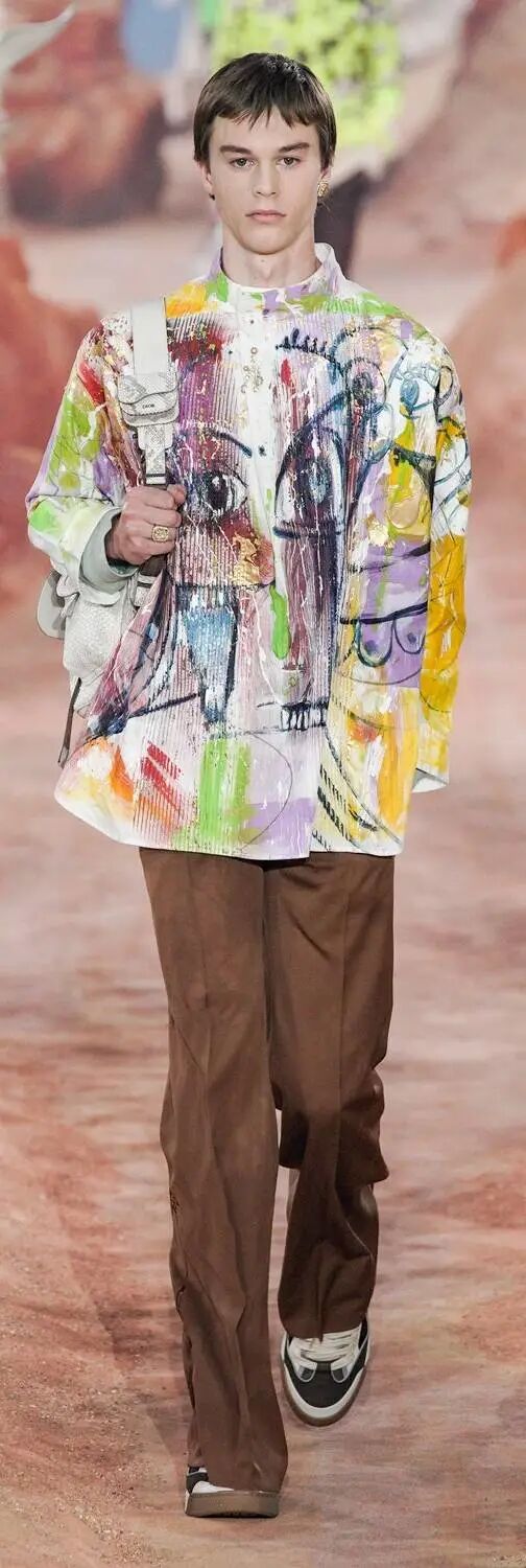 Condo的作品本身就是美国流行风尚与欧洲古典绘画杰作之间的对话,与本季男装系列主题完美契合。这些作品将在秀后进行拍卖,所项将以奖学金形式为年轻创意人才提供支持。