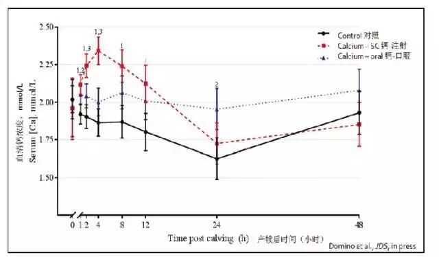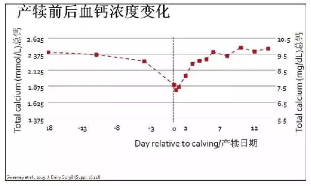 有实验证明奶牛在产犊前后血钙浓度有很大变化,产犊前3周血钙浓度逐渐降低,在临近产犊时降到最低,产犊后逐渐恢复。