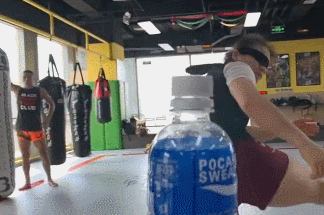 据说,率先发起挑战的是哈萨克斯坦跆拳道冠军法拉比-达莱钦。他在网上发布了挑战的视频。不过,当时有人拿着瓶子,瓶子中还有一多半的水。