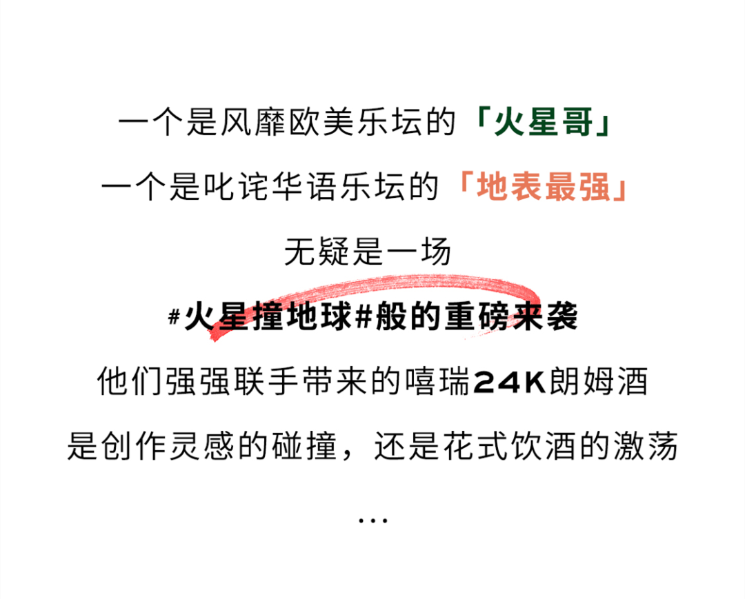 在品尝了火星哥送给他的SelvaRey兰姆酒后,周董立即爱上了它精致柔顺馥郁的口感,想尽快分享给身边的朋友们!两人通过视频聊天,从 SelvaRey 兰姆酒聊到了音乐,还发现两人同样热爱艺术,两人相谈甚欢、一拍即合!于是火星哥正式邀约周杰伦入股,携手合作发展 SelvaRey兰姆酒品牌。而两大天王因为疫情的关系,各自在两地拍摄隔空互动,完成预告片。