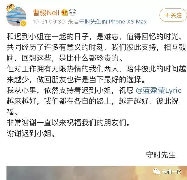 众所周知,实力派男演员曹骏与女演员蓝盈莹在今年十月份的时候公开在微博上发表了分手公告。两个人由于工作的原因,总是无法顾及到双方的感受,所以在长时间的思考下,两个人决定对这段感情说再见。两个人以"迟到小姐"与"守时先生"互相称呼,满满的爱意与不舍也是十分让人感到可惜的。