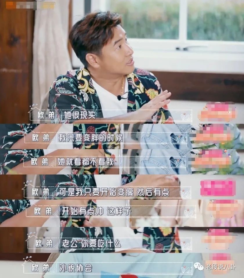 节目中郑云灿一直带着“嘲讽”脸,欧弟说什么她都能怼起来。而欧弟也非常直接当着镜头吐槽妻子很现实,称自己变胖的时候,她看都不看自己,话也不跟自己讲。可是只要自己开始变瘦变帅,她马上会问:‘老公,你要吃点什么?’很外貌协会。