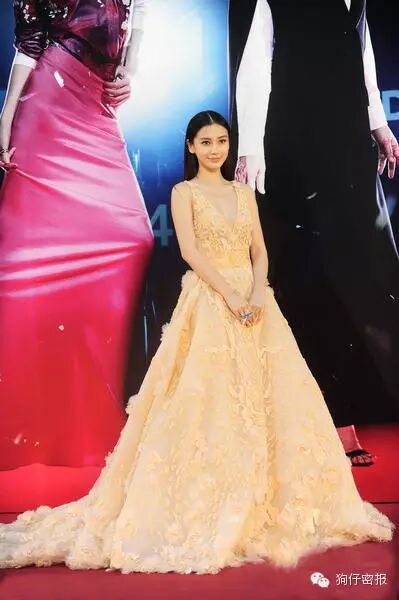 香港金像奖典礼,Angelababy身穿橘黄色深V长裙亮相,同样是曳地长裙,但baby略显沉重感,蕾丝设计更显老了不少~