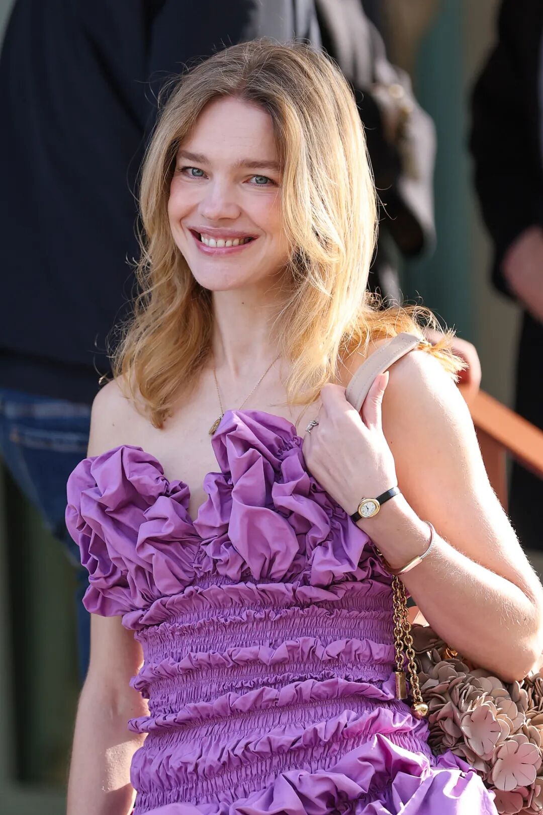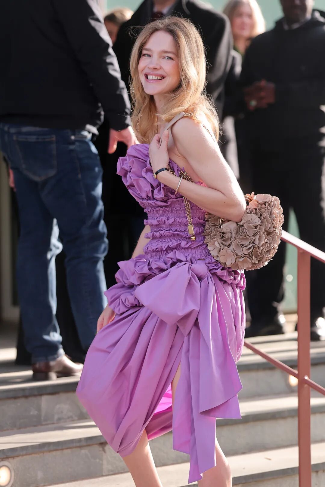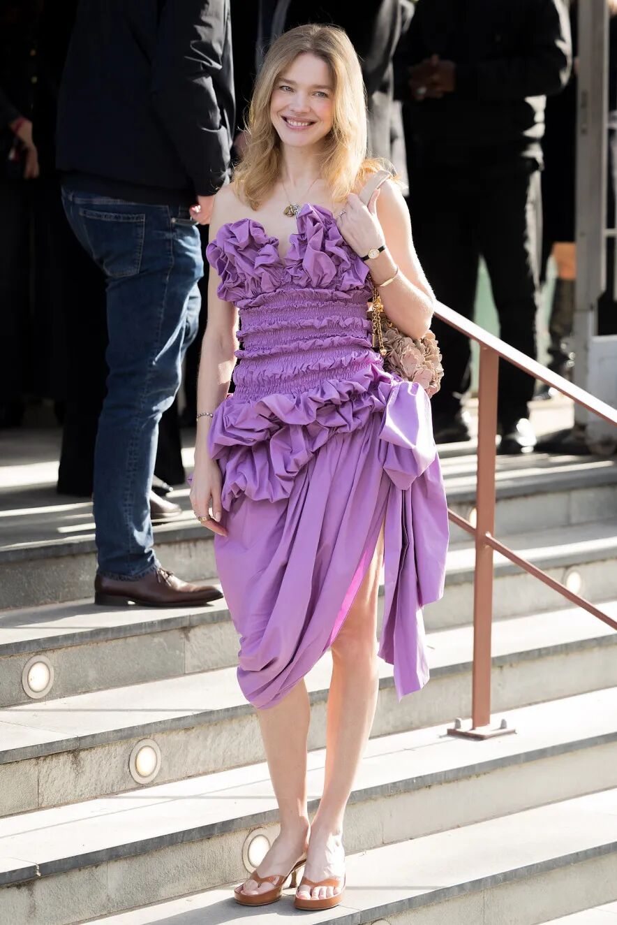 作为 LVMH 集团“大公子”的“太子妃”,网友们对 Natalia Vodianova 的关注从来不止于一位普通的超模。上周,44 岁的她现身巴黎时装周 Chloé 2026 秋冬秀场,身穿一条紫色褶皱抹胸花苞裙,来自 Chloé 2026 春夏系列,俏皮可爱;搭配金色头发与修长身材,像洋娃娃一样,可爱、随性、美得优雅不费力。
