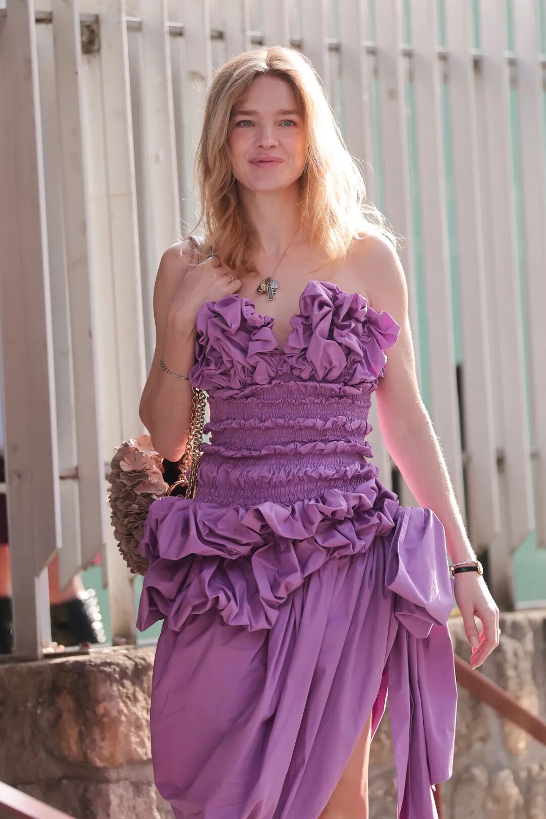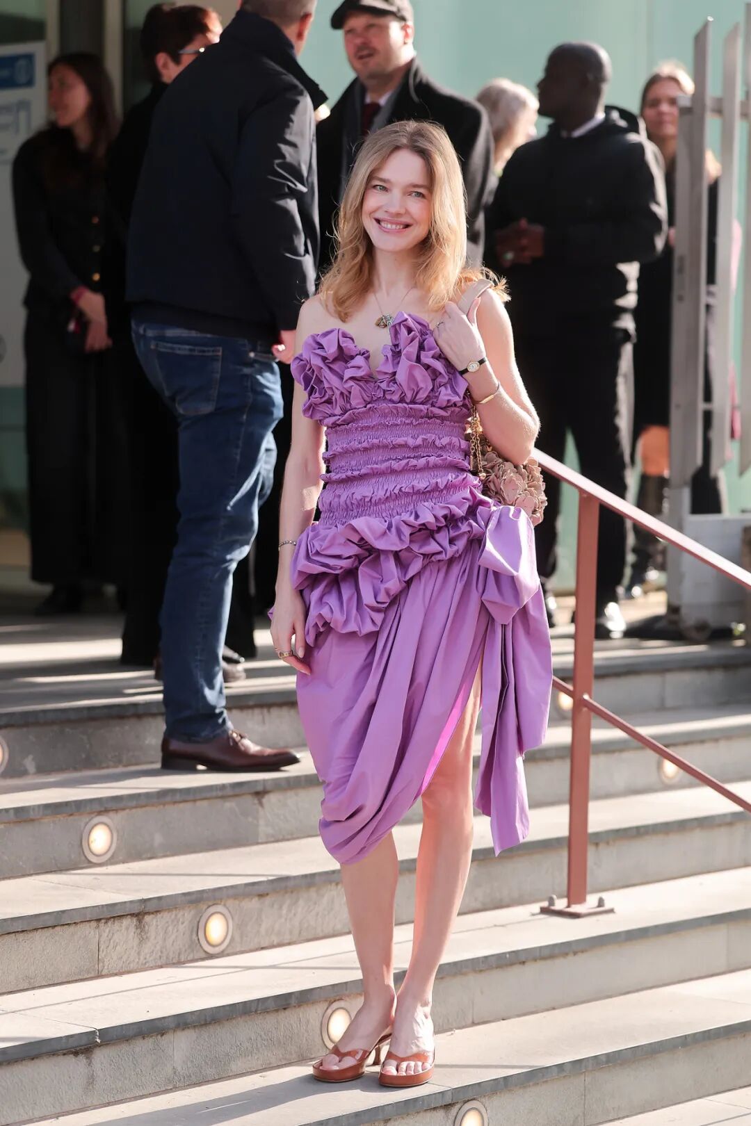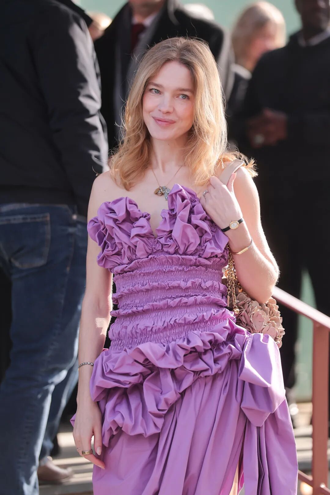 作为 LVMH 集团“大公子”的“太子妃”,网友们对 Natalia Vodianova 的关注从来不止于一位普通的超模。上周,44 岁的她现身巴黎时装周 Chloé 2026 秋冬秀场,身穿一条紫色褶皱抹胸花苞裙,来自 Chloé 2026 春夏系列,俏皮可爱;搭配金色头发与修长身材,像洋娃娃一样,可爱、随性、美得优雅不费力。