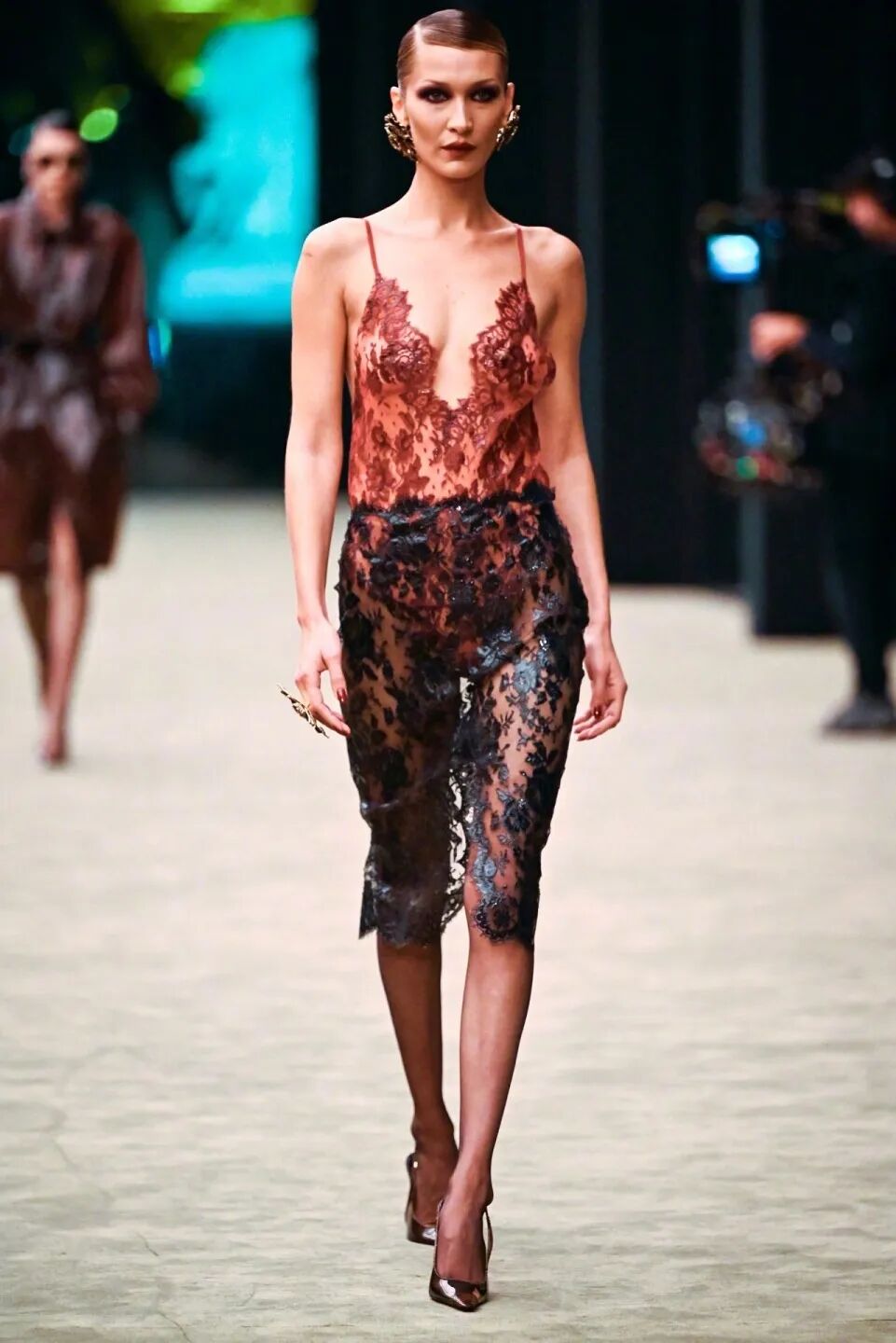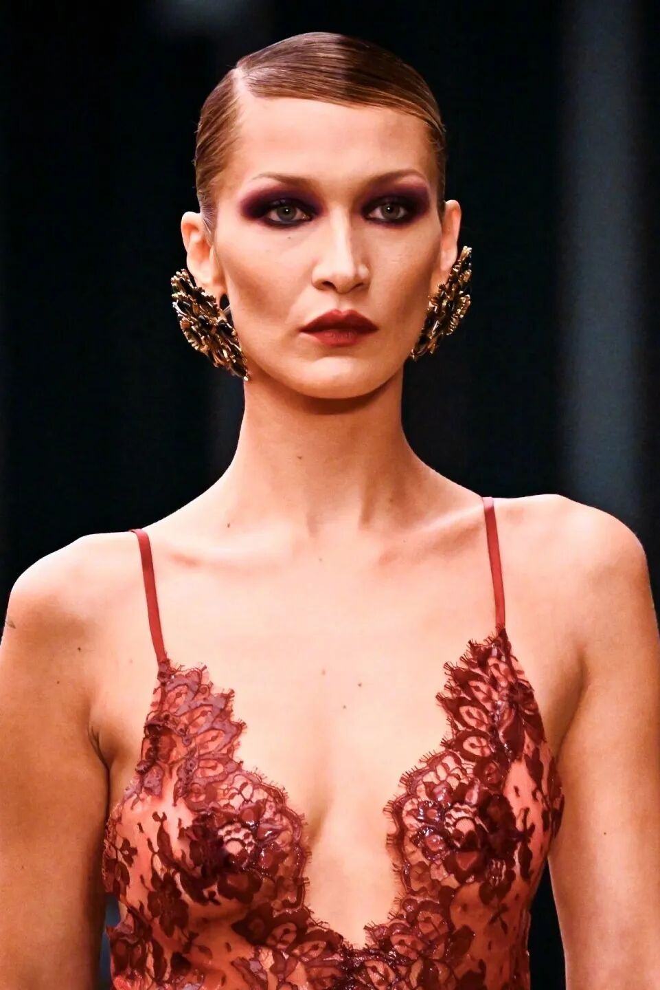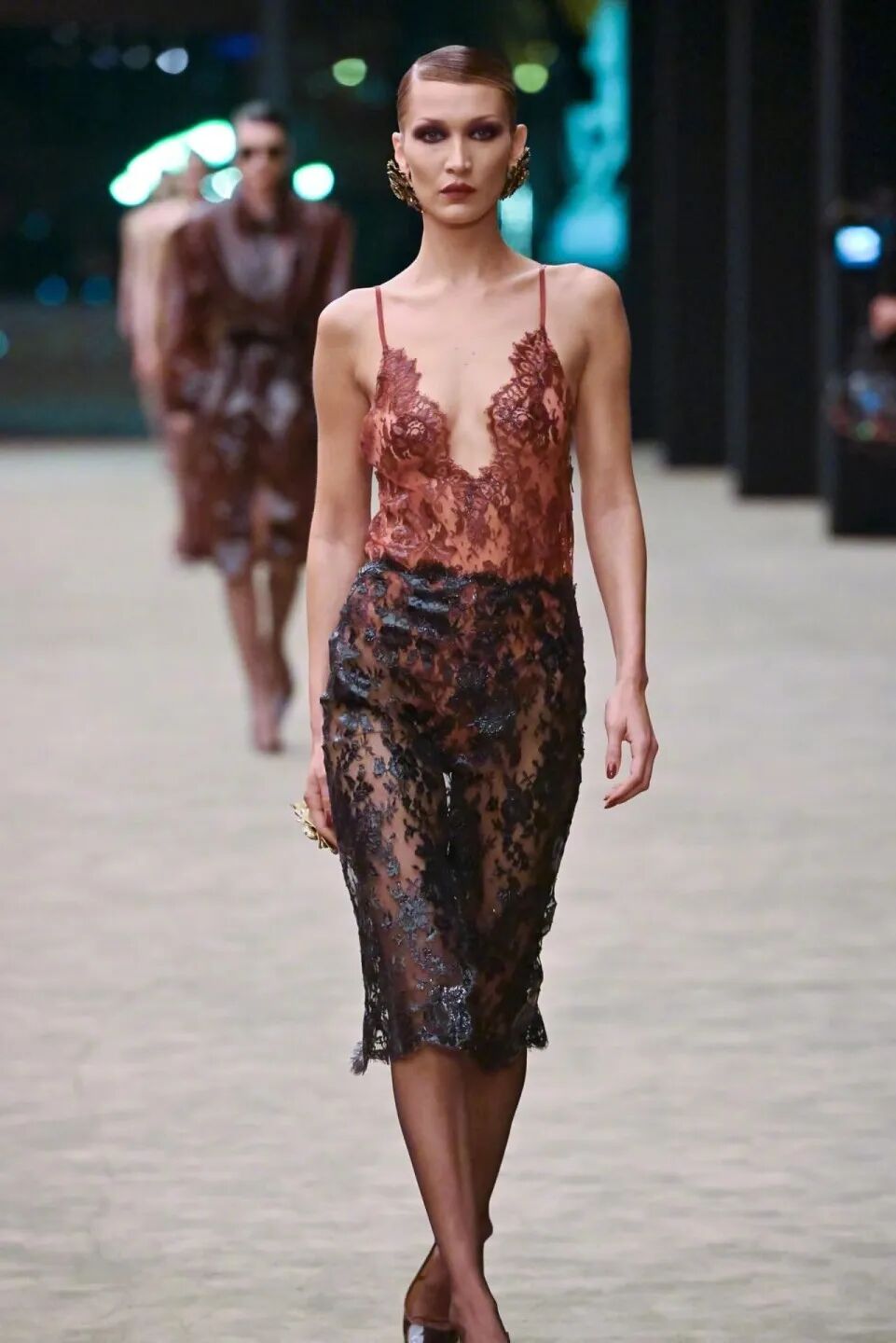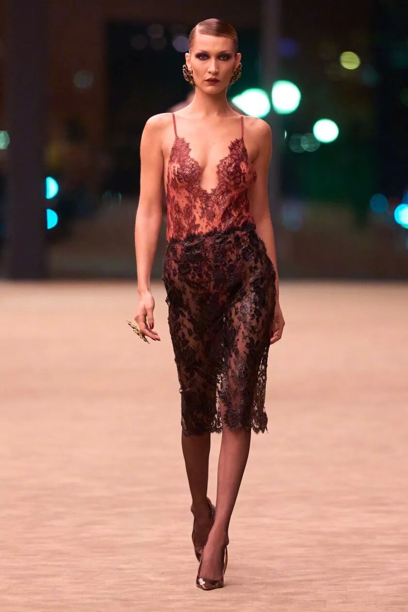 这次在 2026 秋冬系列的走秀,Bella 身穿红色与黑色的蕾丝套装,踩着恨天高,侧分发、发胶固定、盘成低髻,眼妆浓郁烟熏,颧骨微微阴影,深红唇色,加上巨型耳环装点,精准还原了 1970 至 1980 年代 Helmut Newton 拍摄的 SAINT LAURENT 广告风格。