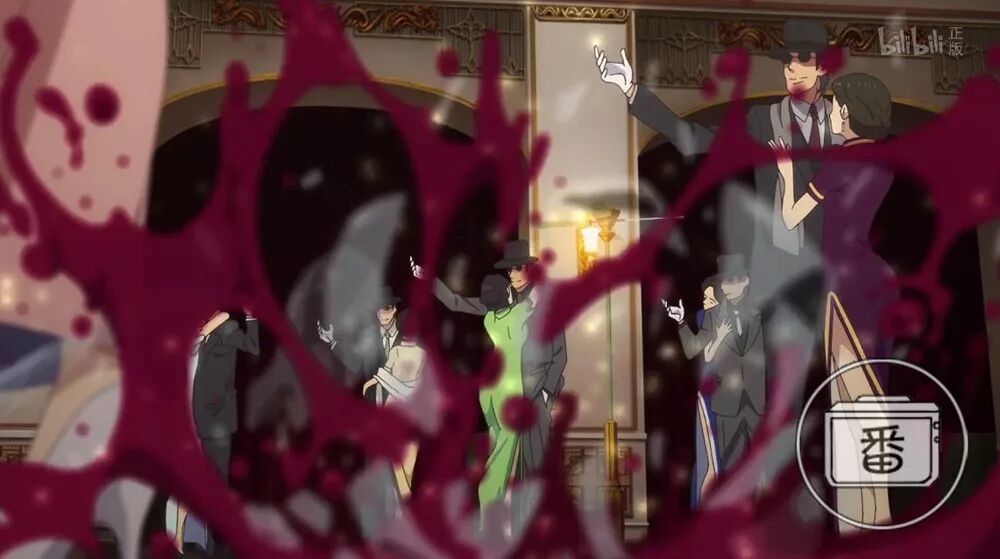 他们一只手端着一杯红酒,另一只手拥抱着一个旗袍贵妇,当主持者说下“愿血族繁盛,为庆祝新世界的开始,干杯!”之时,黑衣人把手中的酒杯摔倒在地,玻璃随之碎裂……