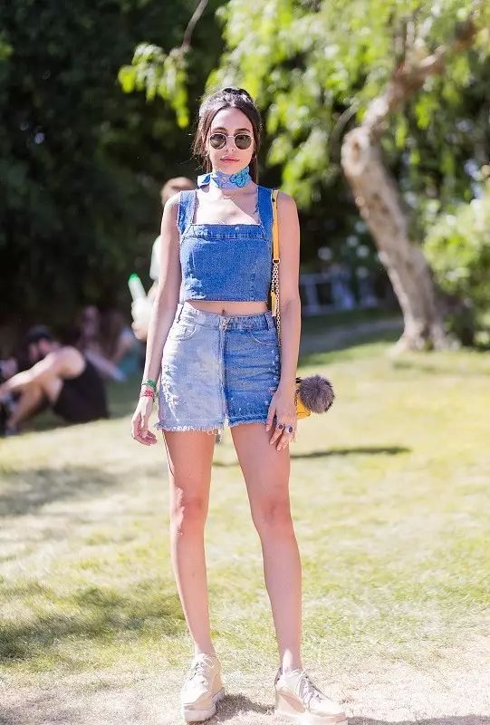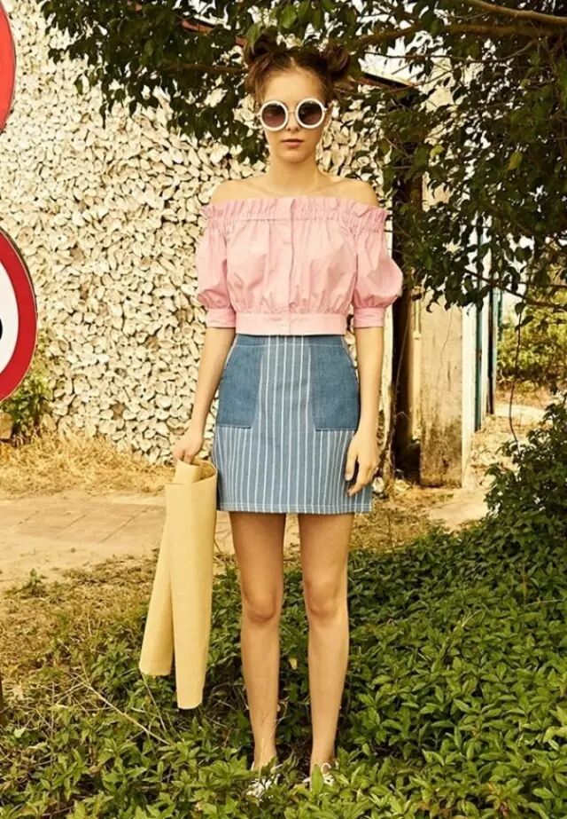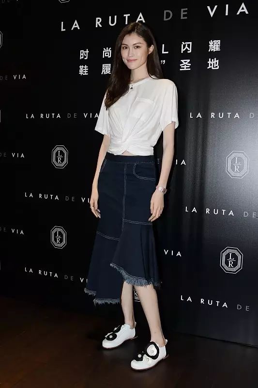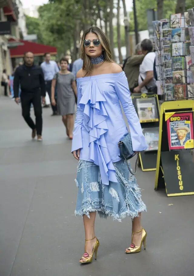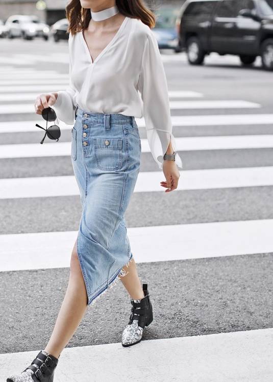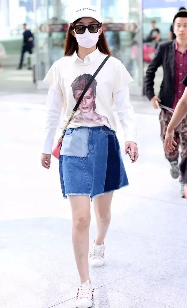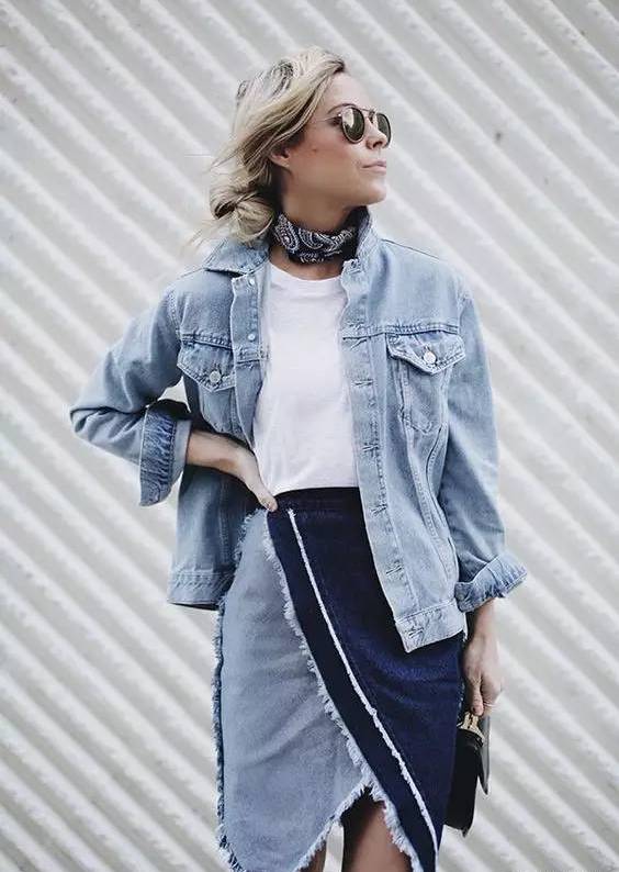 简约的T恤搭配蓝黑色牛仔鱼尾裙