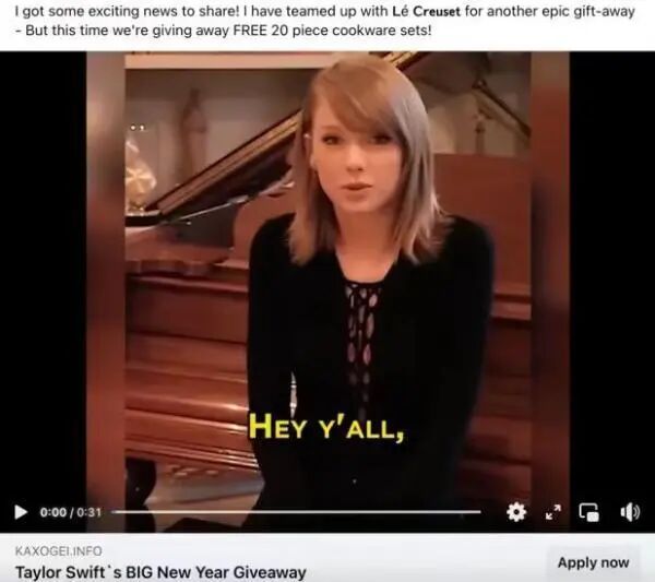涉事公司对此迅速做出回应称,Taylor Swift没有参与任何消费者赠品活动,所有关于产品促销的活动均来自官方社交活动。AI“深度造假”技术合成了她的声音,并将声音与她的形象和Le Creuset广告片段拼凑在一起。