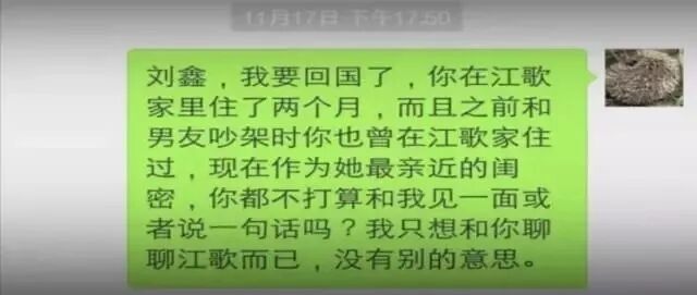 事发后江歌妈妈想了解事发细节,刘鑫也不回信息。江歌妈妈在微博公布杀害江歌的是刘鑫的前男友,刘鑫威胁说再出这种新闻,就停止协助。