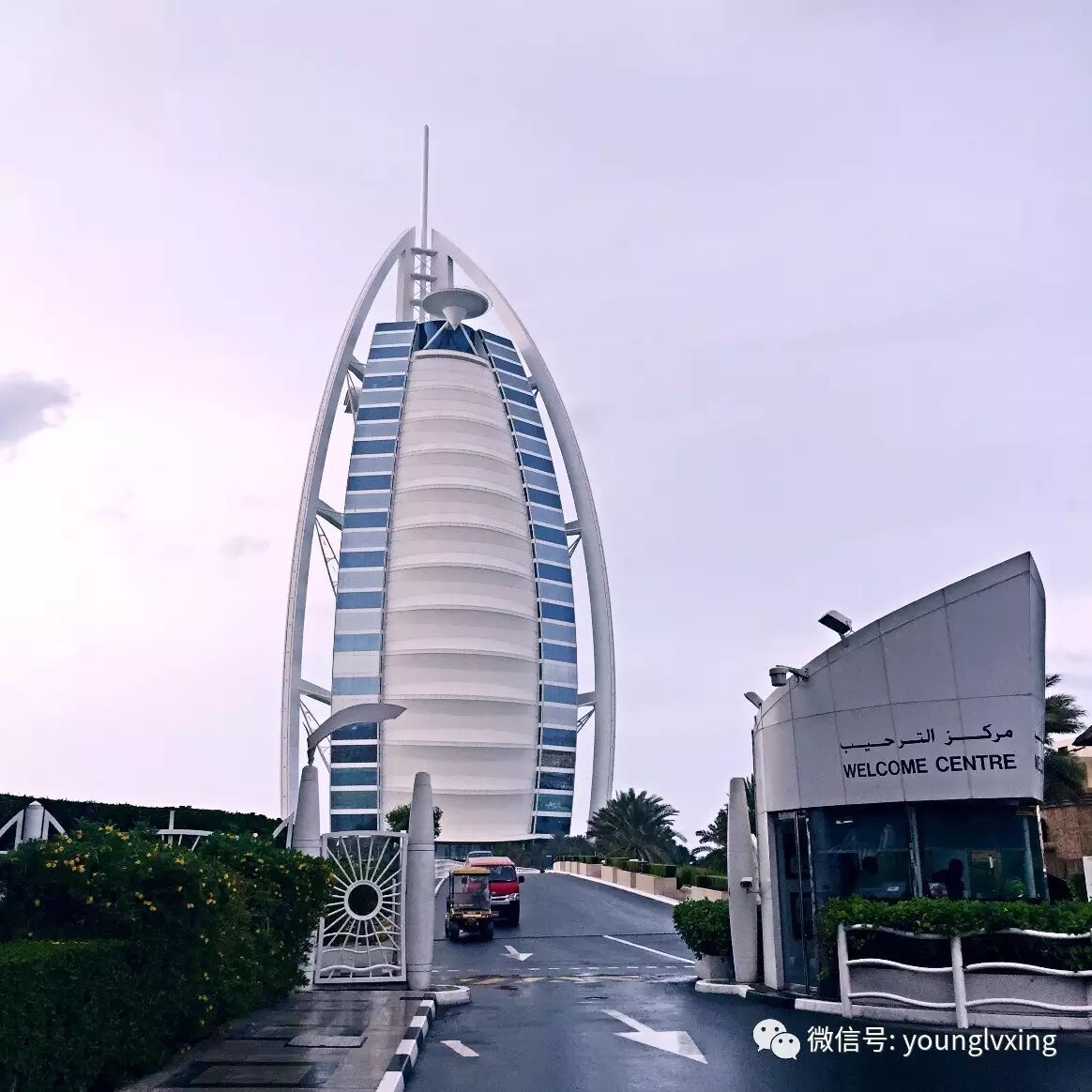 全球第一家七星级酒店:帆船酒店(Burj Arab)。高321米,56层。乘坐两个酒店之间免费的接驳车到了门前,拿不出房卡也不用餐,门卫不让进。阵雨袭来,同事失去了入内的想法,因此我们只在外面拍了个照。