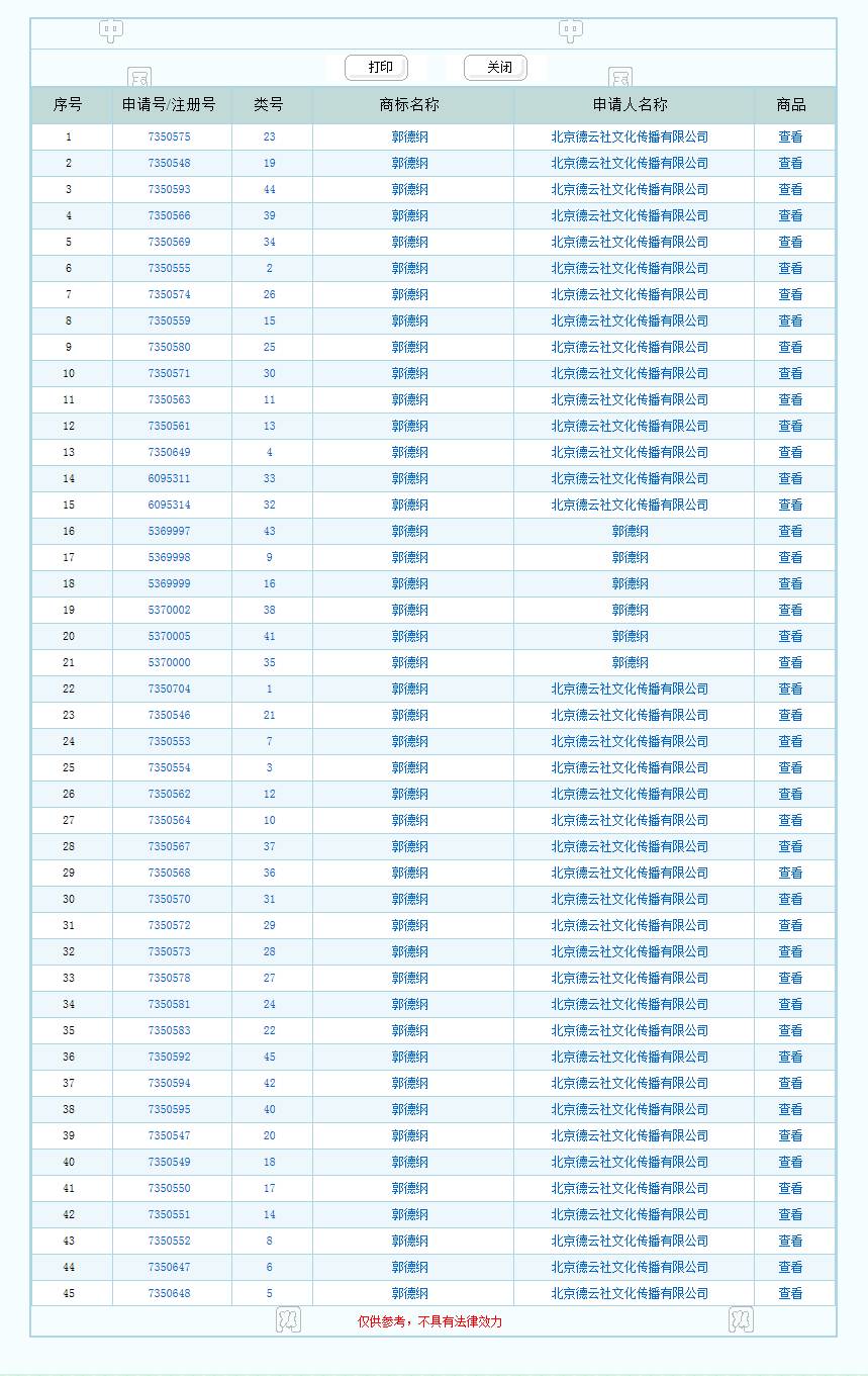 在中国商标网查询的“郭德纲”商标注册申请结果如下图所示