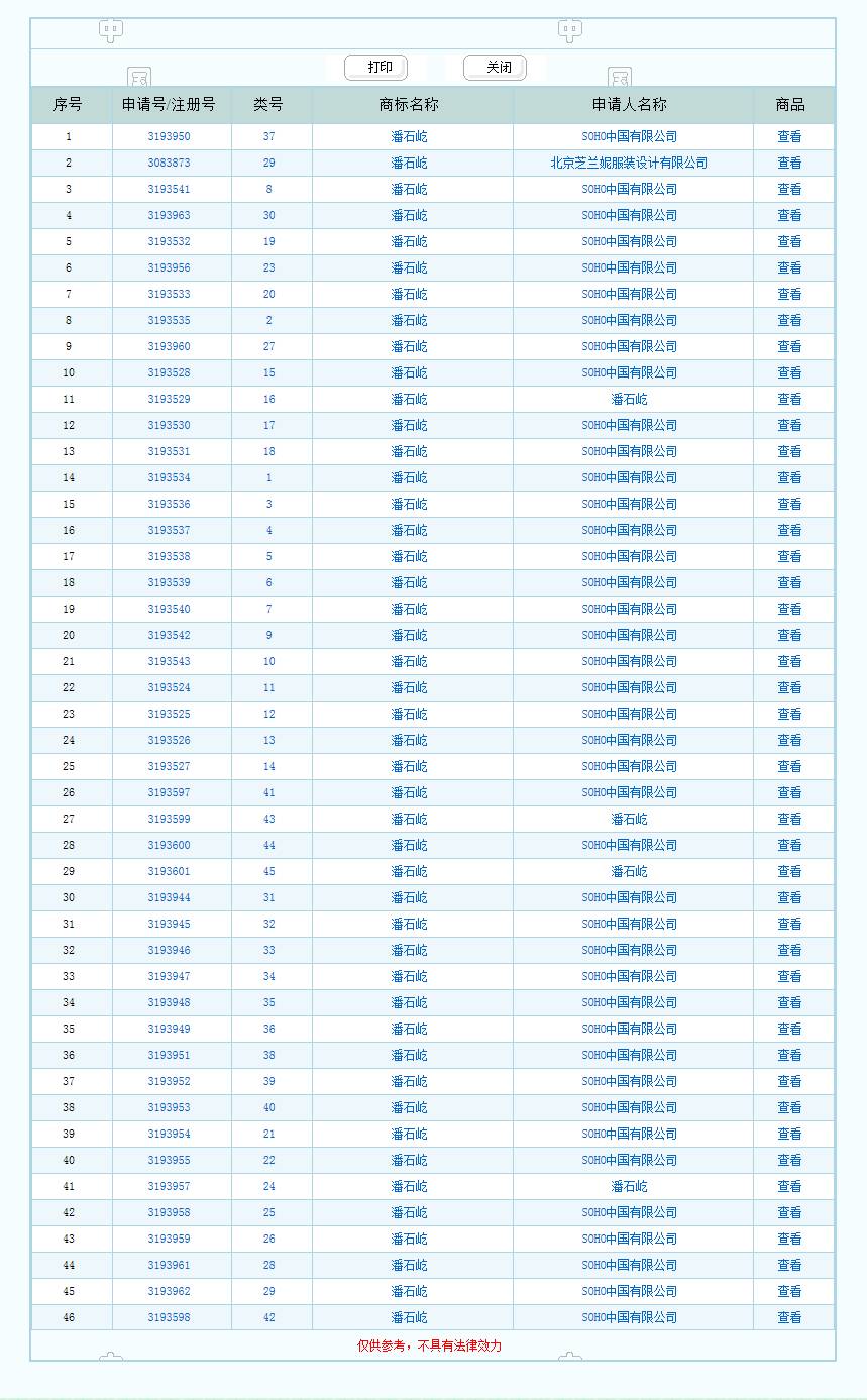 说到自媒体的商标,肯定会涉及到类似微博名称,微信公众号名称,其中类似郭德纲的全类别商标注册还有“微博大V”soho中国老总潘石屹,他也将自己的名字以公司名义和个人名义进行了商标全类别注册,共注册了56个商标,包括自己的名字”潘石屹“以及拼音“panshiyi”。