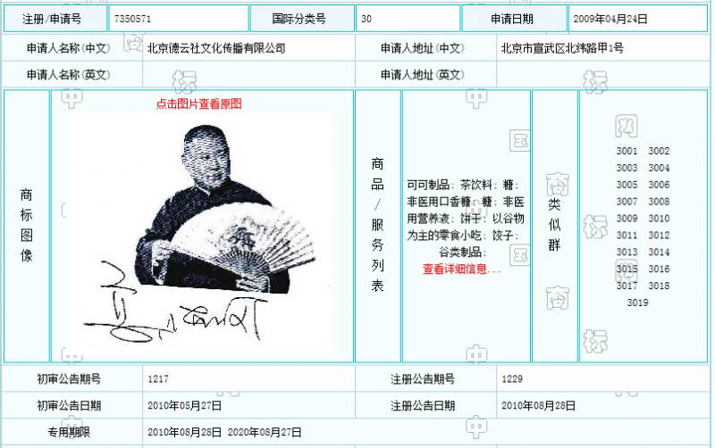 郭德纲都发现注册商标的重要性,先以个人的名字申请注册了商标,之后再以公司名义申请的其他类别的商标,可谓保护的十分全面。以公司名义注册的第30类“郭德纲”商标,该商标于2009年4月24日申请注册,并于2010年12月7日注册成功。该商标的服务列表中包含:可可制品; 茶饮料; 糖; 非医用口香糖; 糖; 非医用营养液; 饼干; 以谷物为主的零食小吃; 饺子; 谷类制品等等。