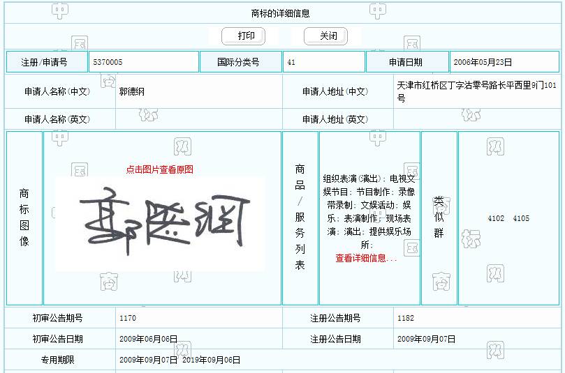 本以为“郭德纲”的商标有可能会被其他人抢注,看得出郭德纲或者是他的团队的商标意识真的很强呀,早几年就提交了商标注册申请,而且在几年前已经注册成功了!