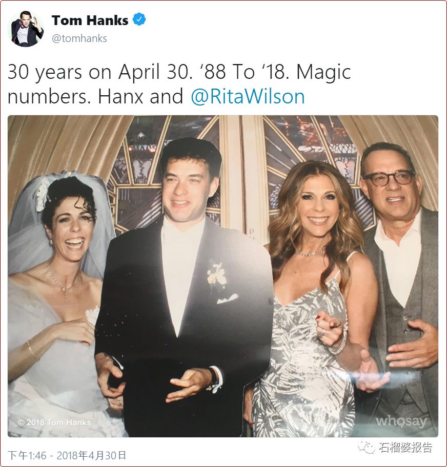 这周一是汤姆·汉克斯和妻子Rita Wilson结婚30周年纪念日,他发了照片庆祝。