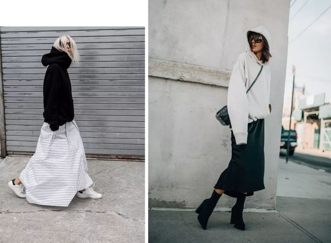 休闲运动风的卫衣,搭配各色可甜可盐的裙子,也会碰撞出别样的时尚感~