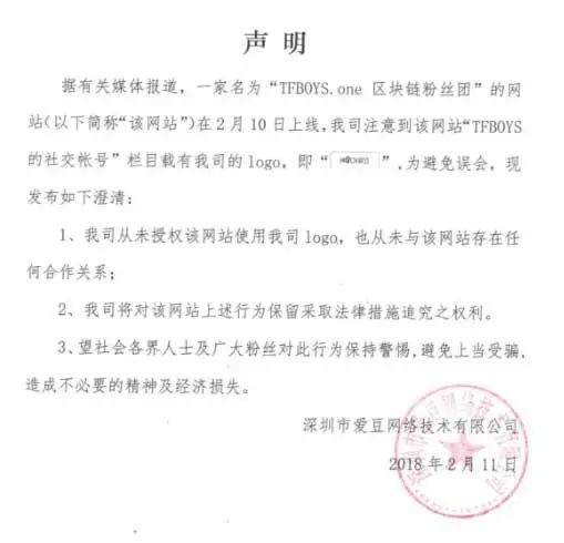 深圳市爱豆网络技术有限公司(爱豆APP)昨日发布声明称,“TFBOYS的社交账号”栏目载有爱豆APP的LOGO,但公司从未授权该网站使用此LOGO,两者不存在任何合作关系,对此网站行为保留采取法律措施的权利,并提醒广大粉丝切莫上当。此前,TFBOYS团体所属北京时代峰峻文化艺术发展有限公司官方发布声明澄清与TFBOYS区块链项目的关系。