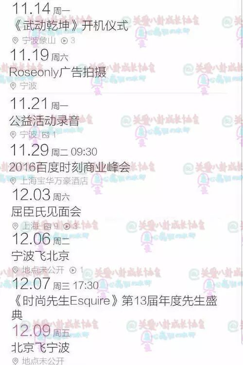 (话说上次剧组工作人员接受采访说,我们又不在剧组怎么可能有剧组资料,这有点太小瞧我们了哇哈哈……我们在剧组有线人啊哈哈)最新的update之后这个事情先放一边,昨天有小老婆(以及很多网友)又发现了另一个问题,就是杨洋在拍新剧期间,疑似多次外出参加商业活动。下面是网友们发的行程表。