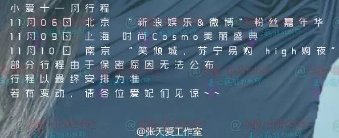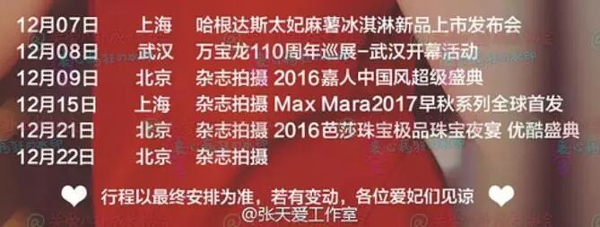 这张行程表里的活动基本都有新闻通稿,大家存疑的话可以去搜一下。而这部戏的女主角张天爱,也是差不多的节奏,11月14号剧组开机后的行程并未公布,但12月份就有六个活动,分别在上海、北京、武汉,离剧组都不近。
