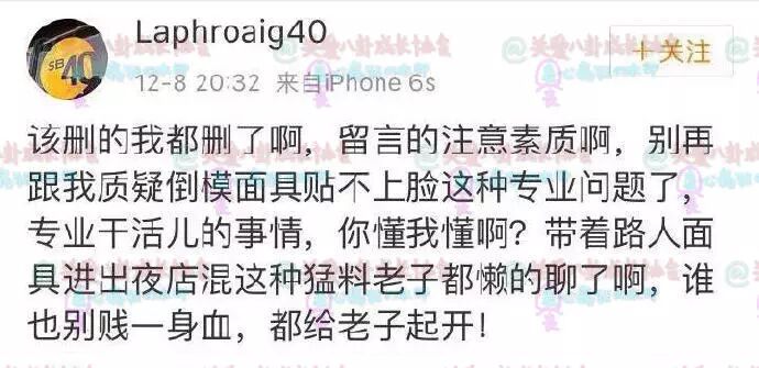 反正最后的结果是汪老湿删了微博,但又爆了另一个料,说有艺人带着路人面具去夜店鬼混。