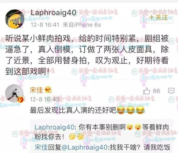 小老婆们好啊,我知道你们都在等着今天的八卦!昨晚编剧汪启楠老湿(不认识的自己去度娘)在微博上爆料,称有小鲜肉拍戏除了近景,其余都是真人倒模,靠替身戴人皮面具拍完。女演员小宋佳还在底下评论,但之后就秒删了。(事情闹得太大了应该大家都知道吧)